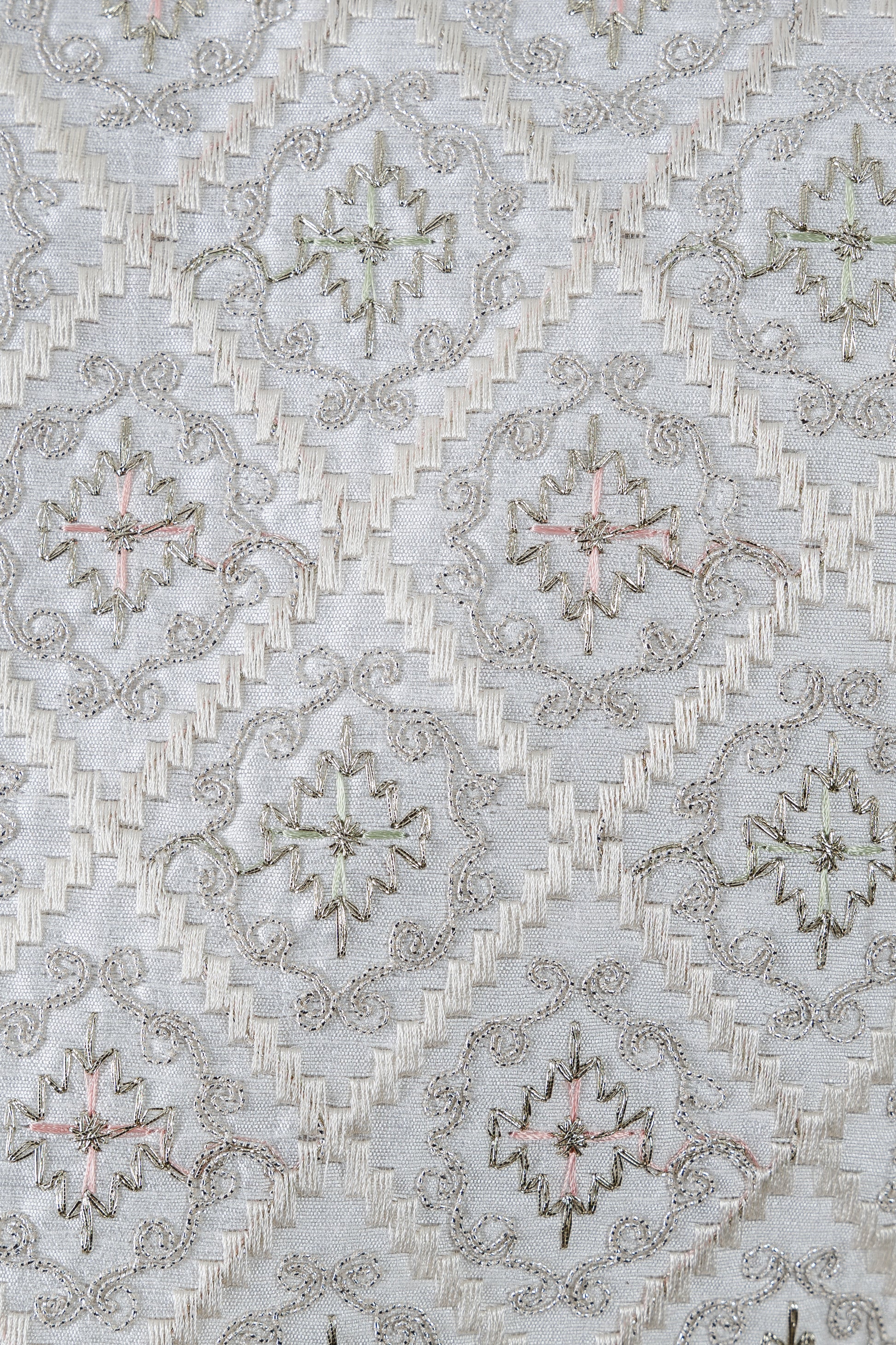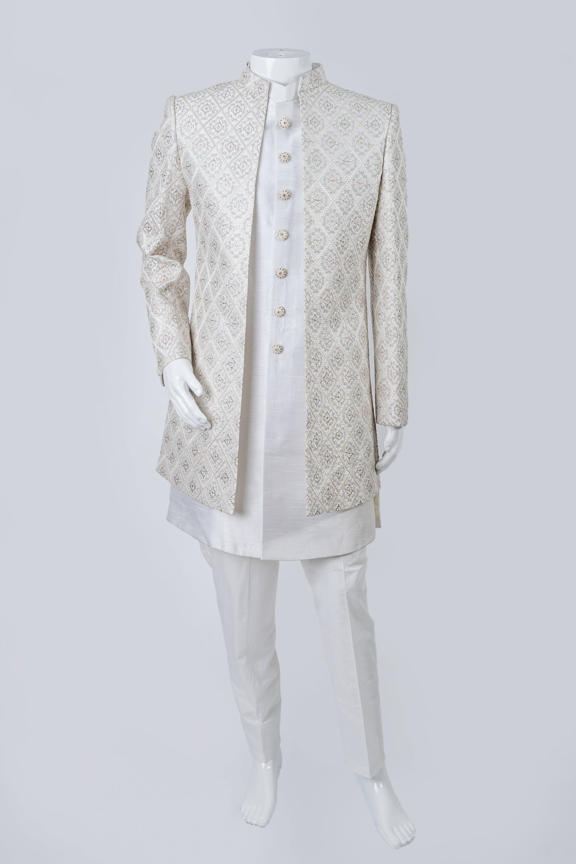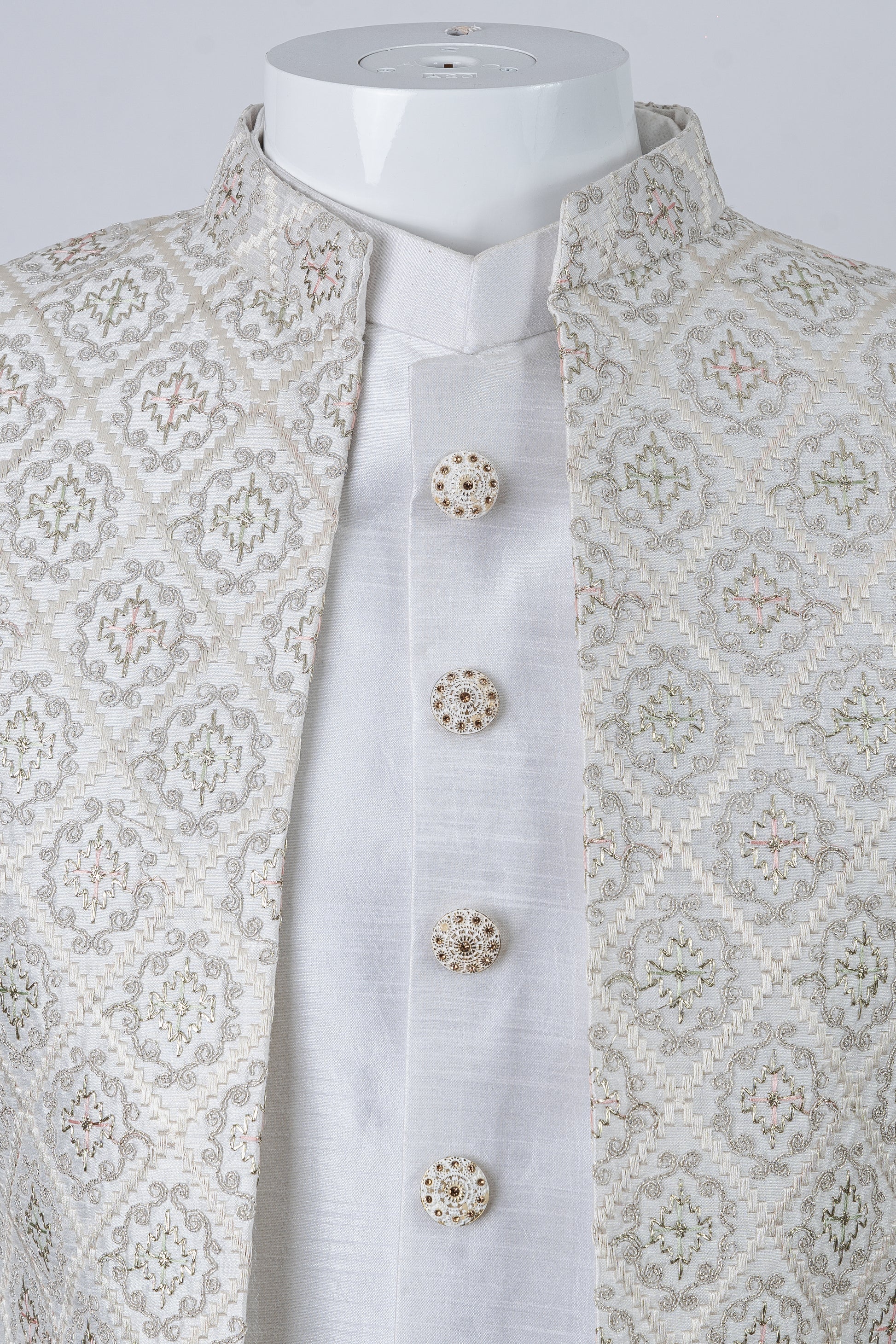 This white embroidered Indo-Western set features elegant thread and zari work. The set includes the detailed jacket, a pant, and a kurta. This set showcases expert craftsmanship and intricate detailing for a timeless and sophisticated look. For wash care, dry clean only.