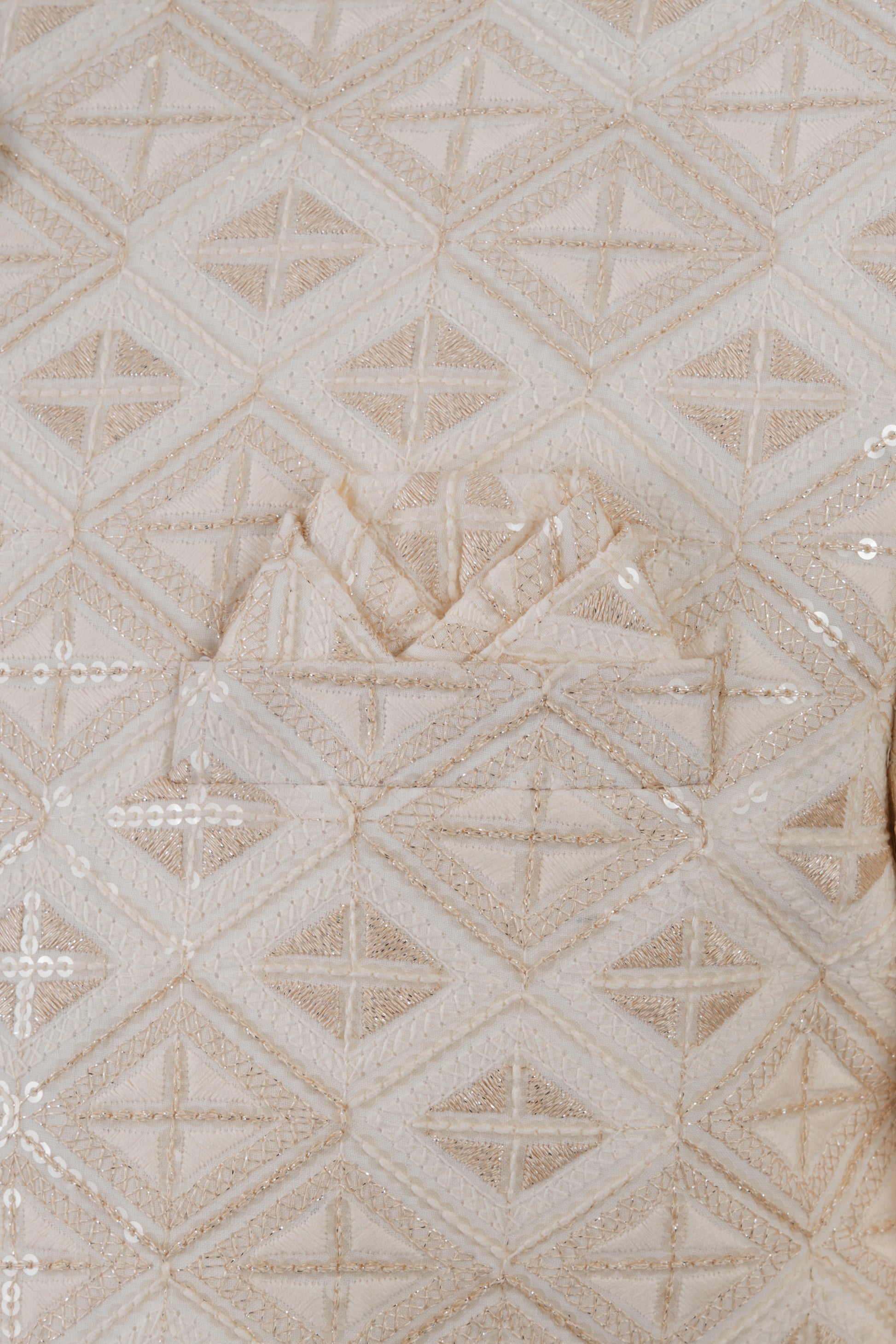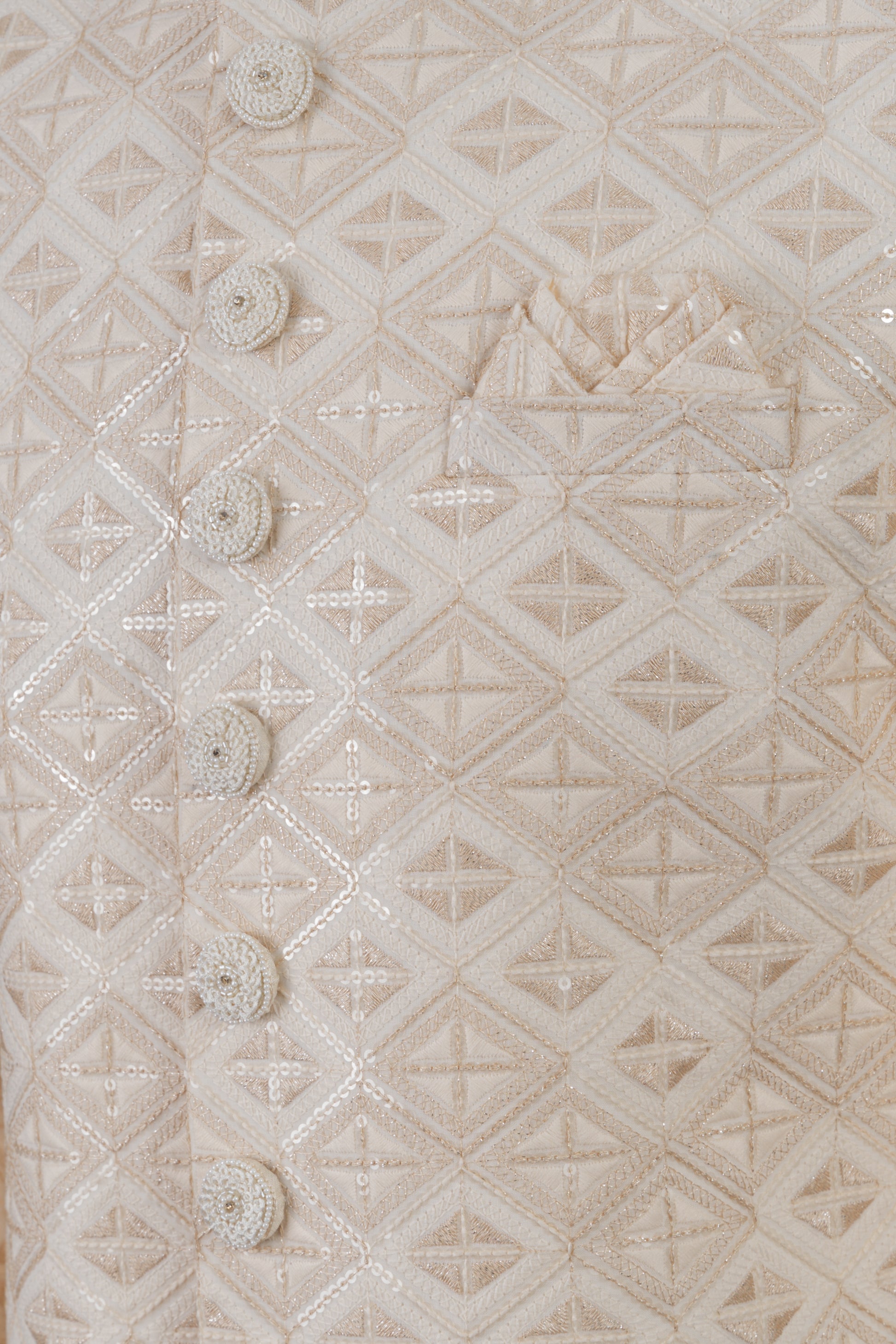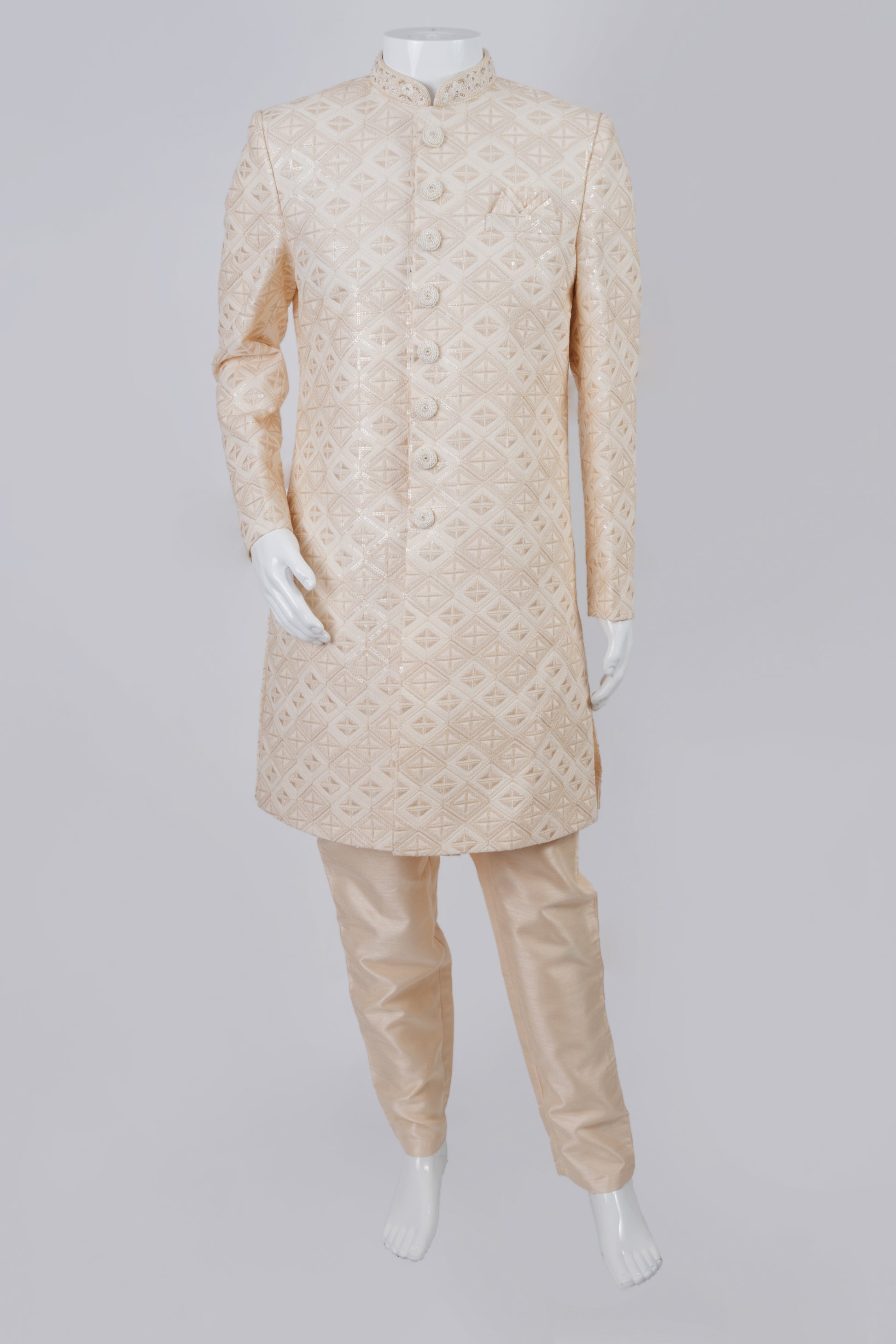 This beige sherwani features intricate threadwork in a diamond pattern and exquisite sequins. Sophisticated and elegant, the set includes a jacket and a pant and a matching pocket square to complete the look. Stay looking sharp with this elegant ensemble. For wash care, dry clean only.