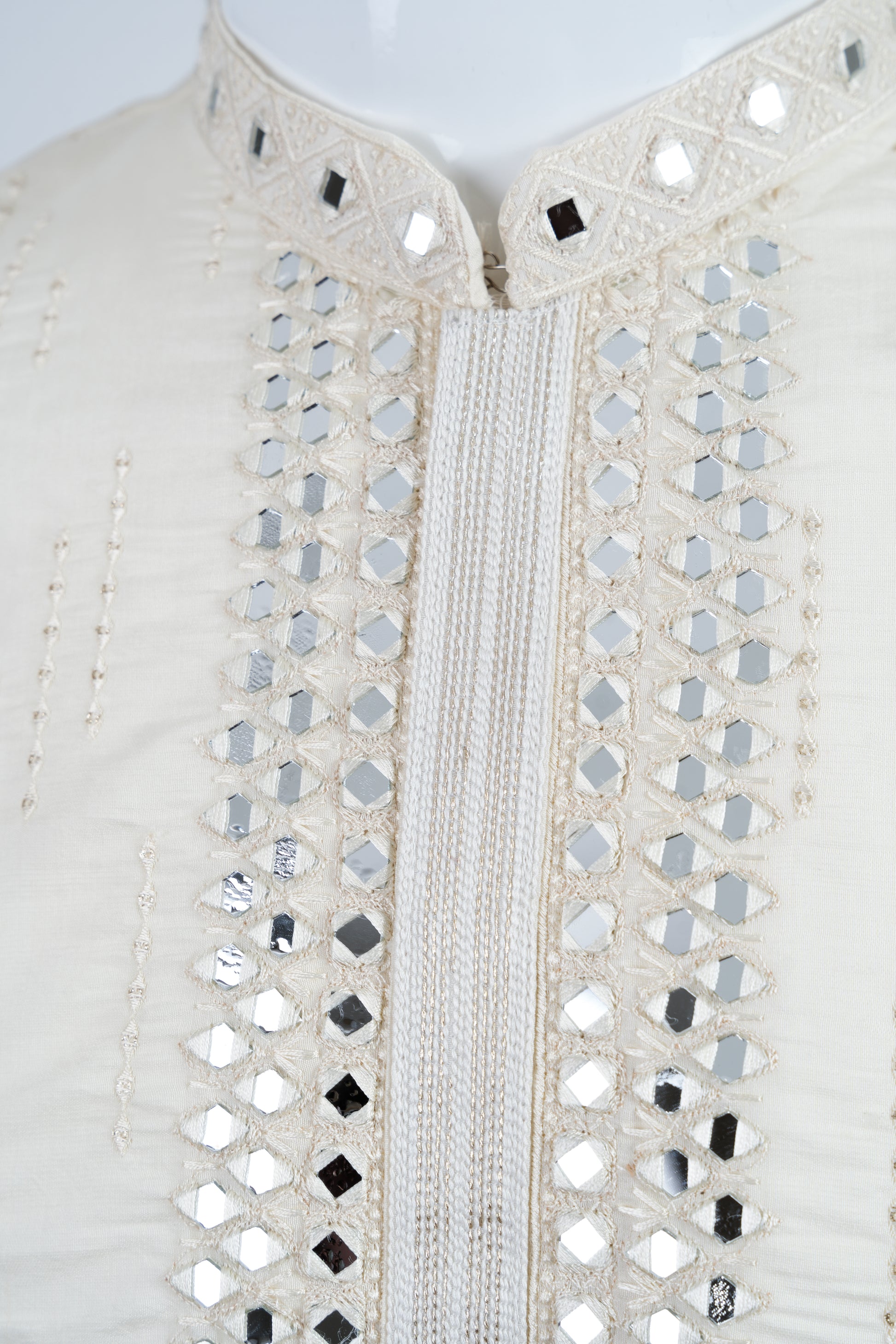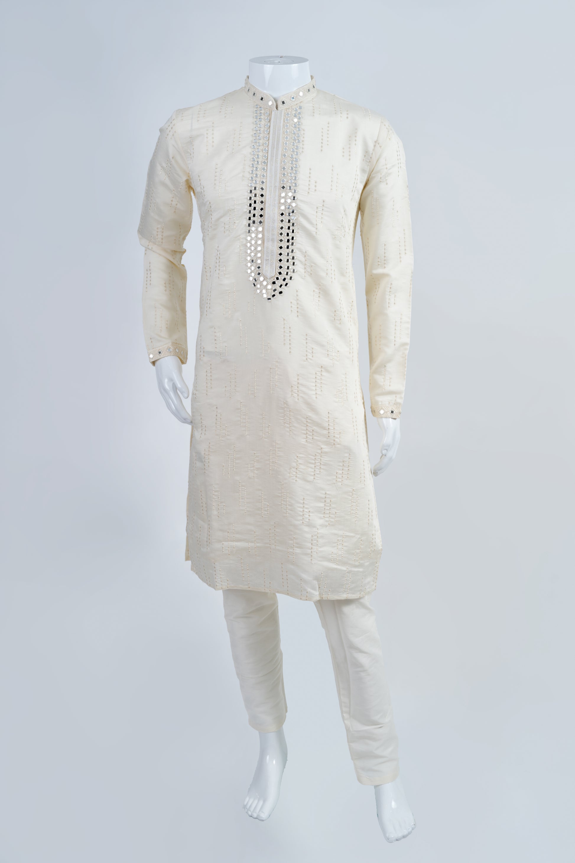 This beige kurta set is perfect for adding a touch of elegance to your occasion. Made from soft cotton fabric, the plain design is accentuated with stunning mirror work, adding a touch of sophistication. The set includes a kurta and pants (pyjama), and is best cared for with dry cleaning.