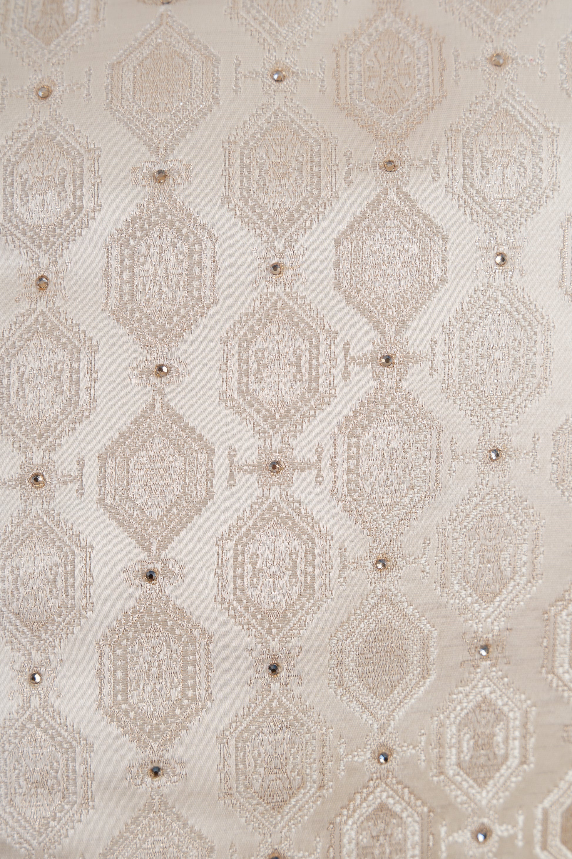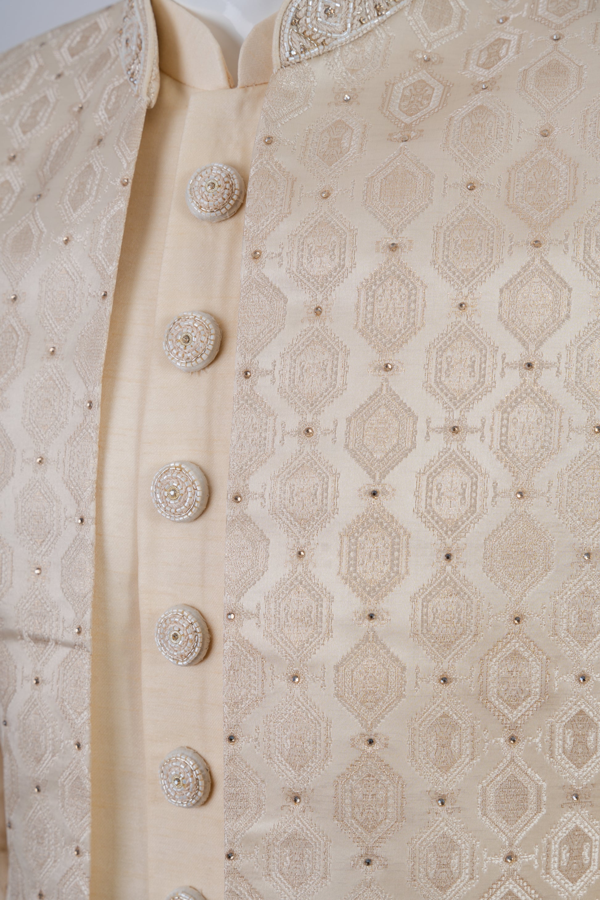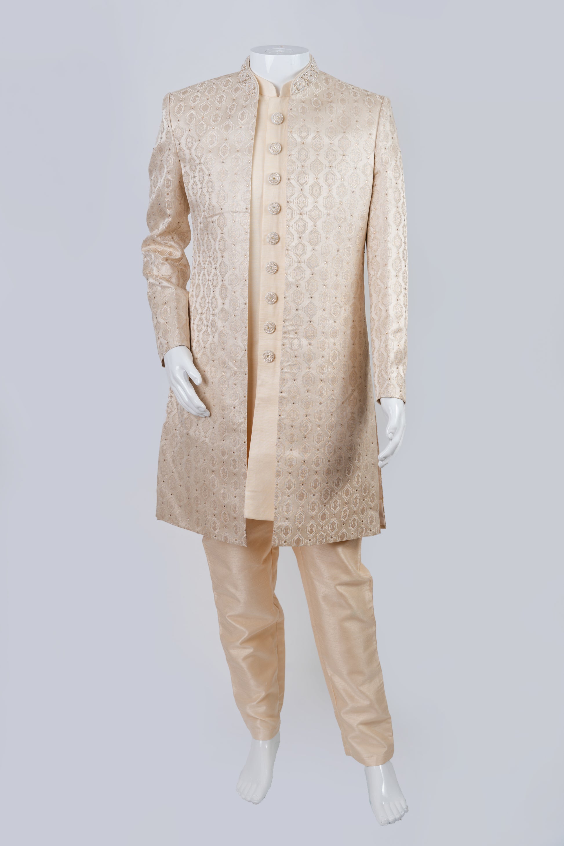 This biscuit brown octagon threadwork sherwani set features high-quality rayon fabric, intricate threadwork, and subtle sequins. Sophisticated and elegant, the set includes a jacket, a pant, and a kurta. Stay looking sharp with this elegant ensemble. For wash care, dry clean only.