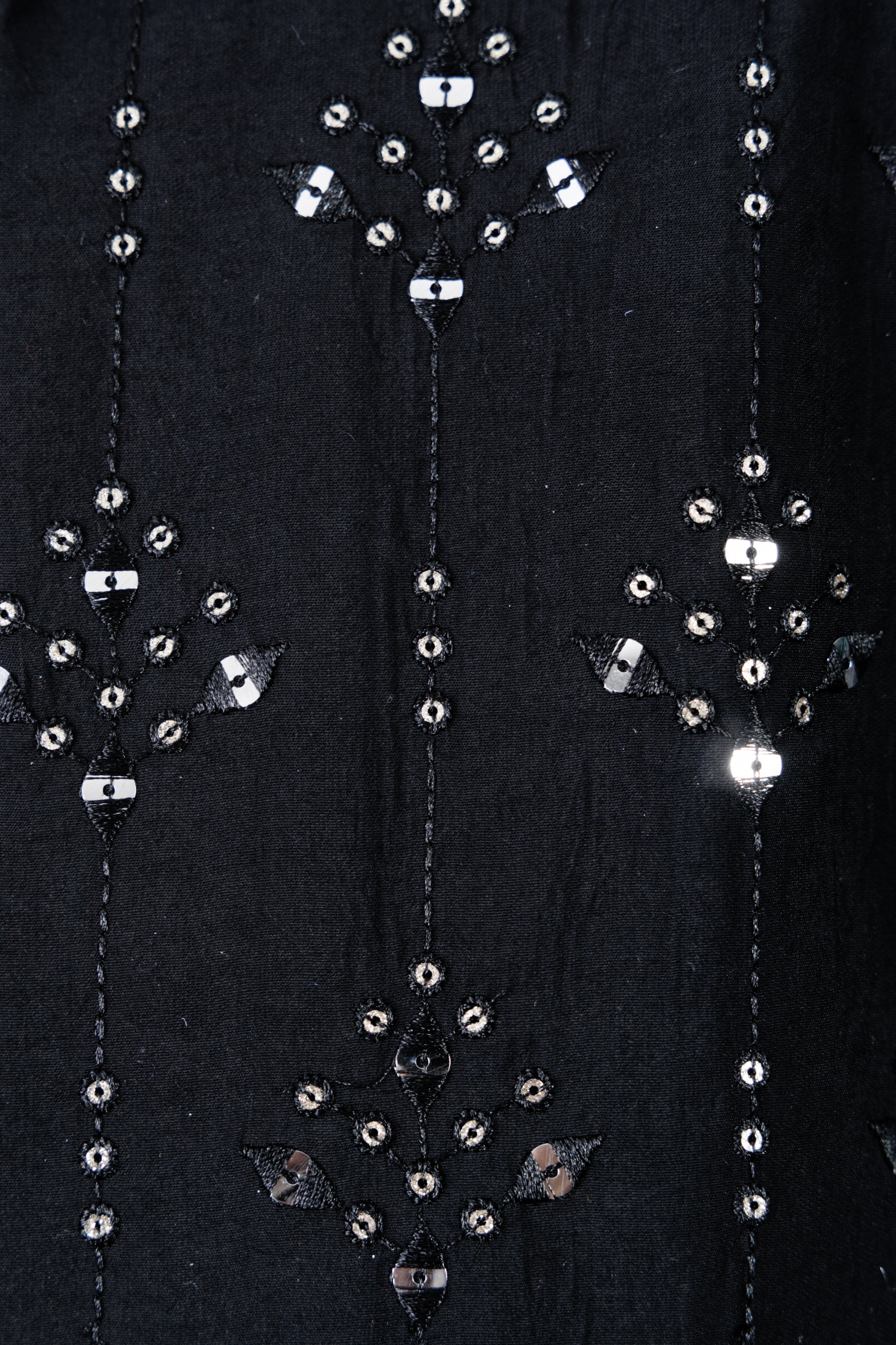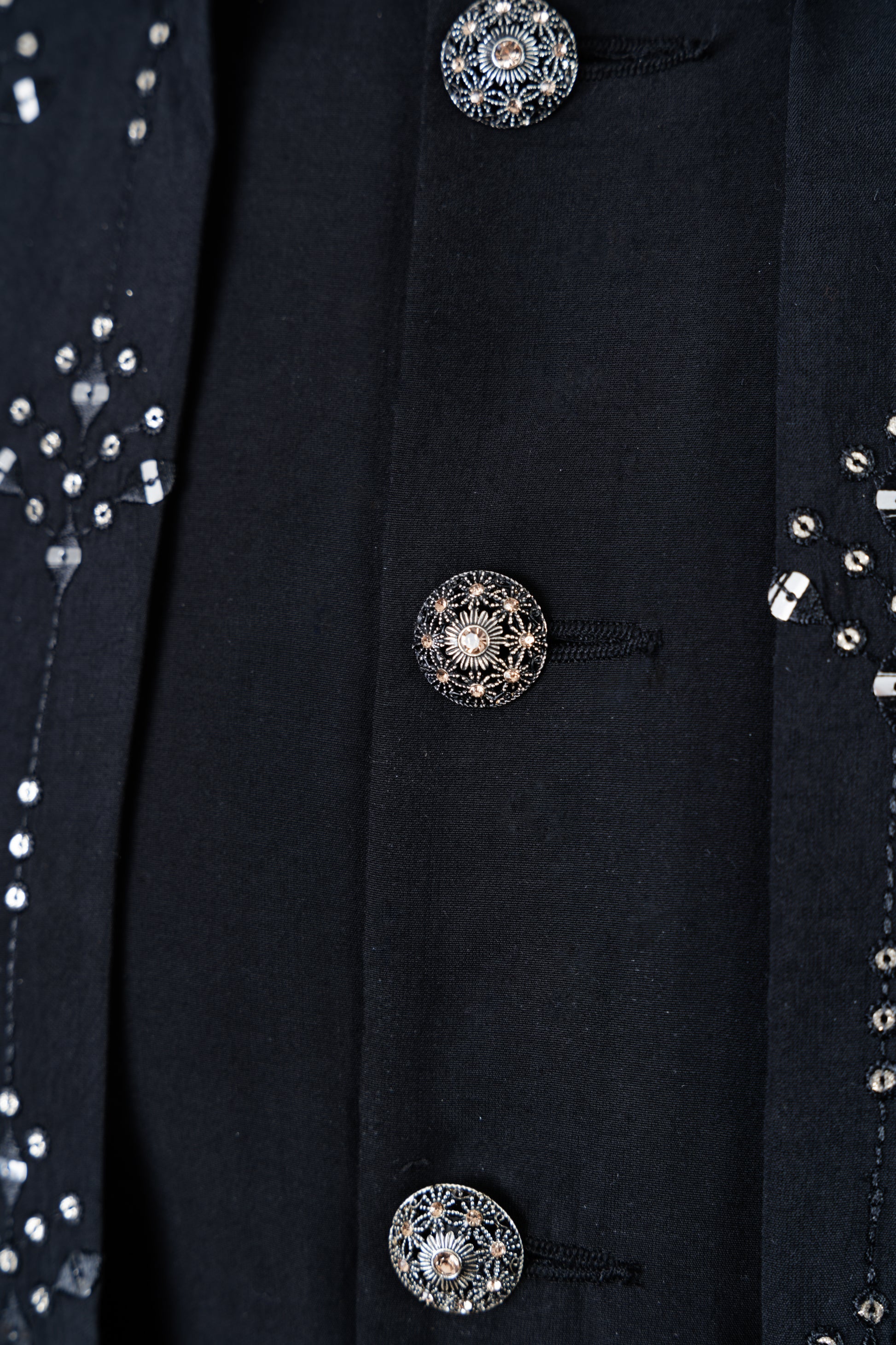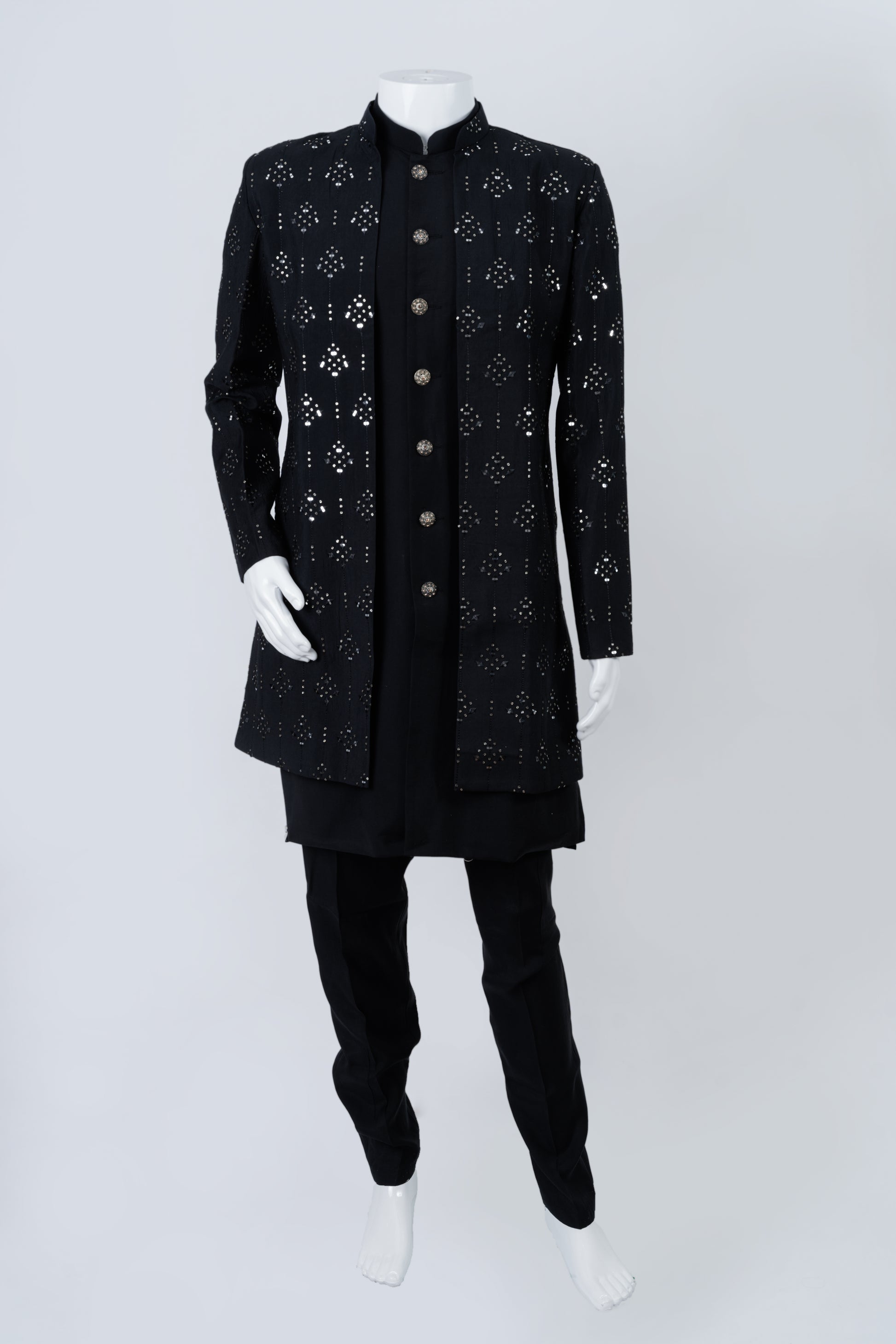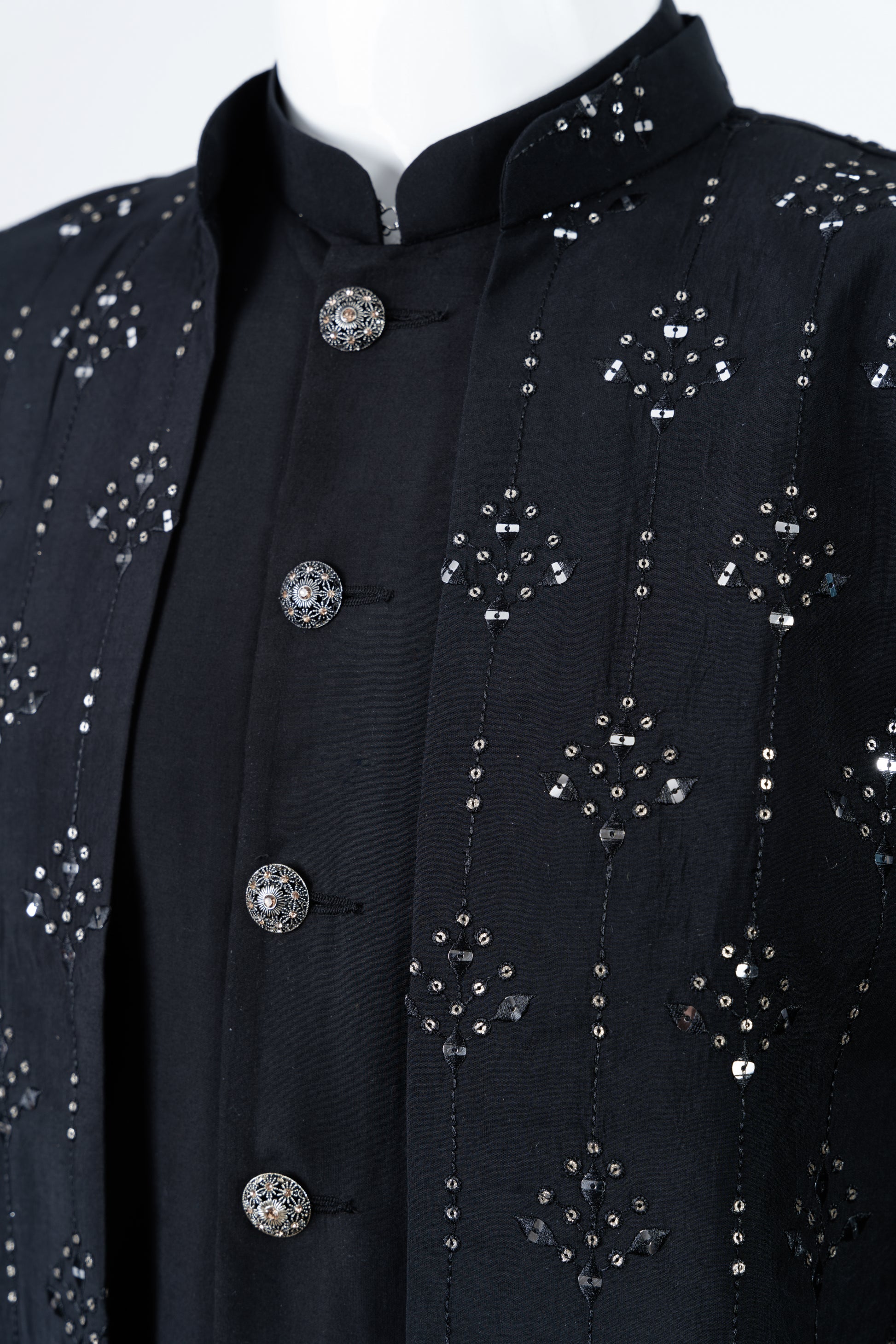 Discover the stunning style of our black Indo-Western set. Made with luxurious soft cotton-silk fabric, this set features intricate mirror and sequin work, adding a touch of elegance to the outfit. The set includes mirror and sequined jacket, a pant, and a kurta. To preserve its beauty, simply dry clean only.