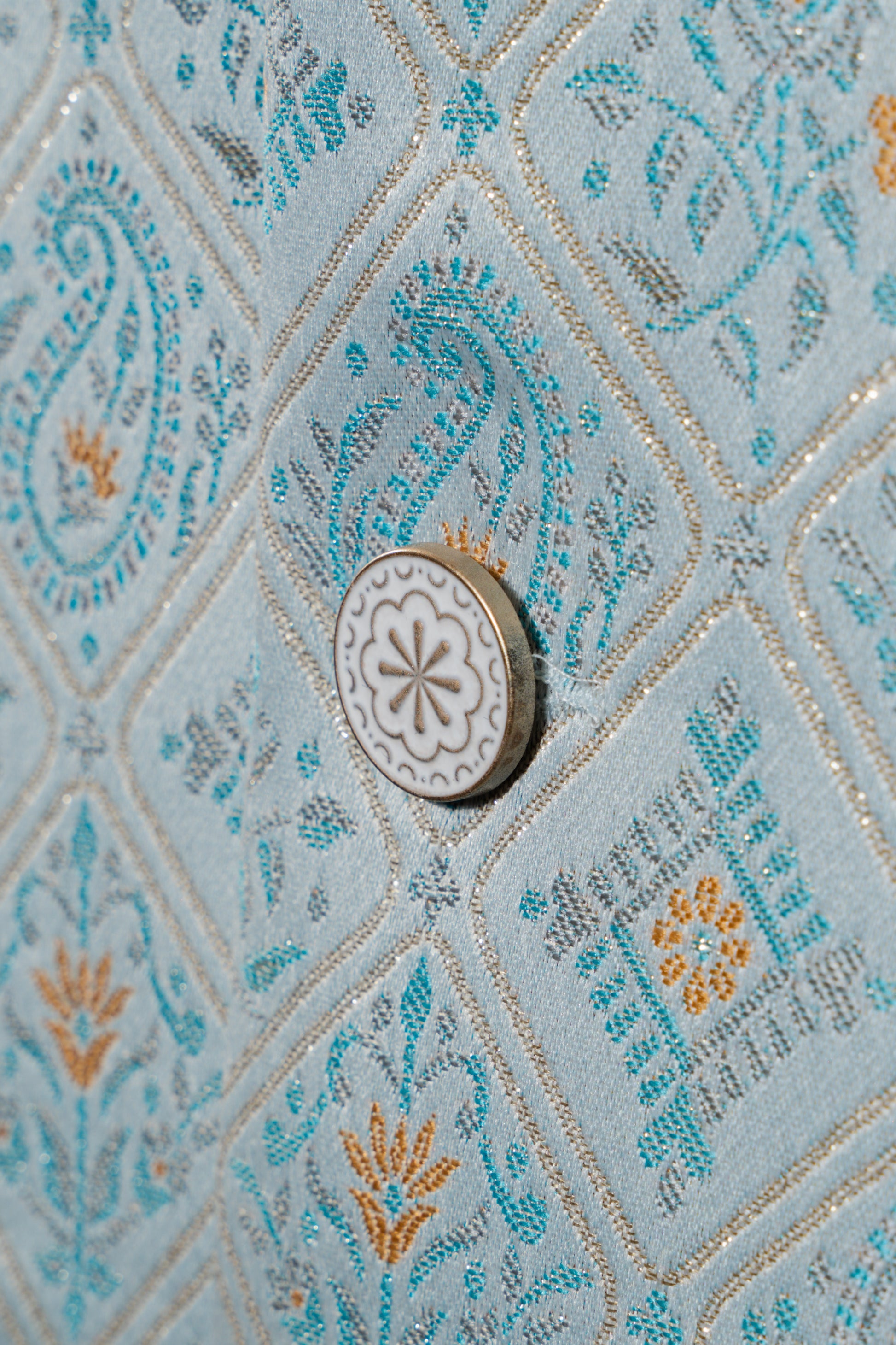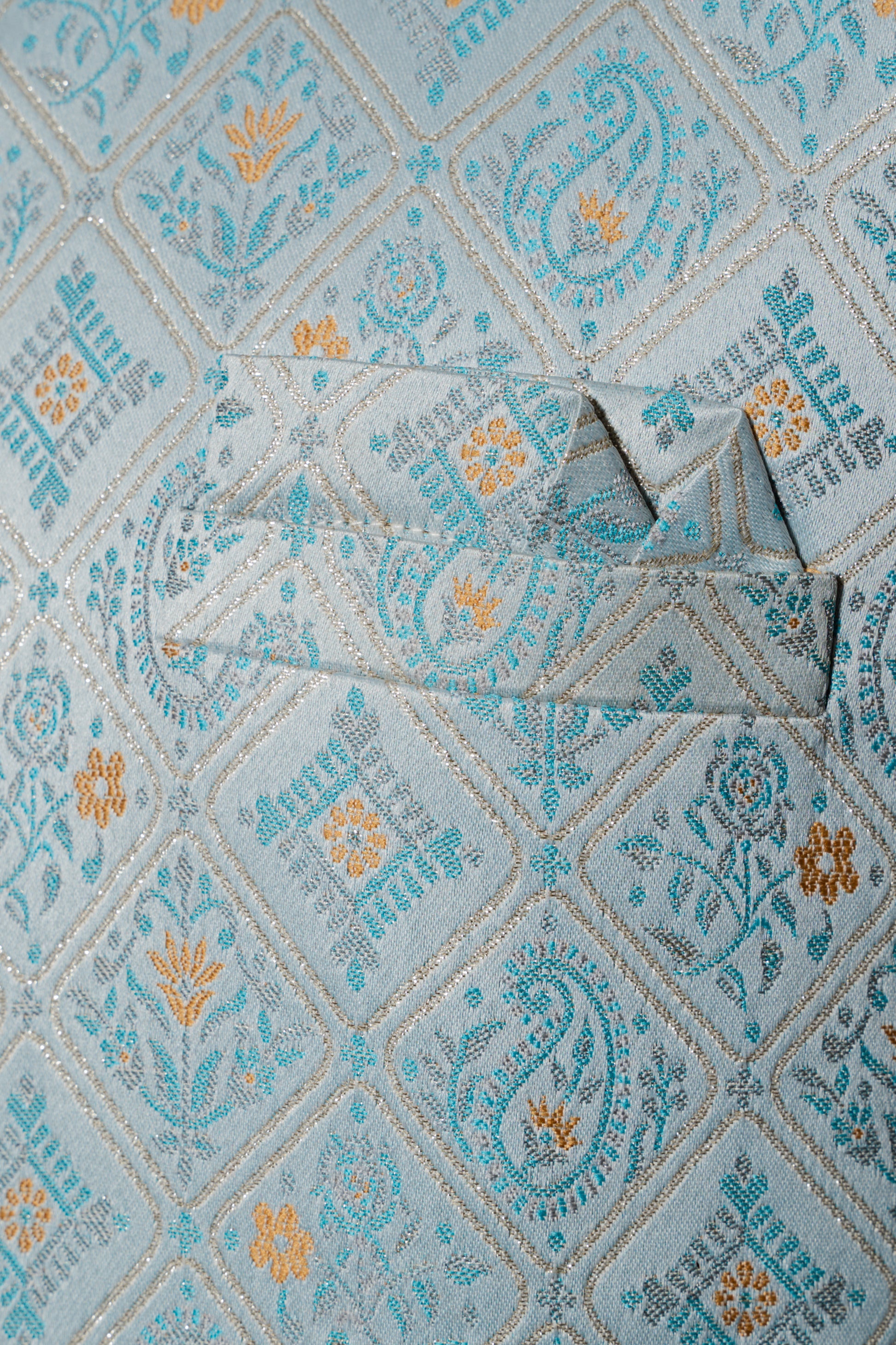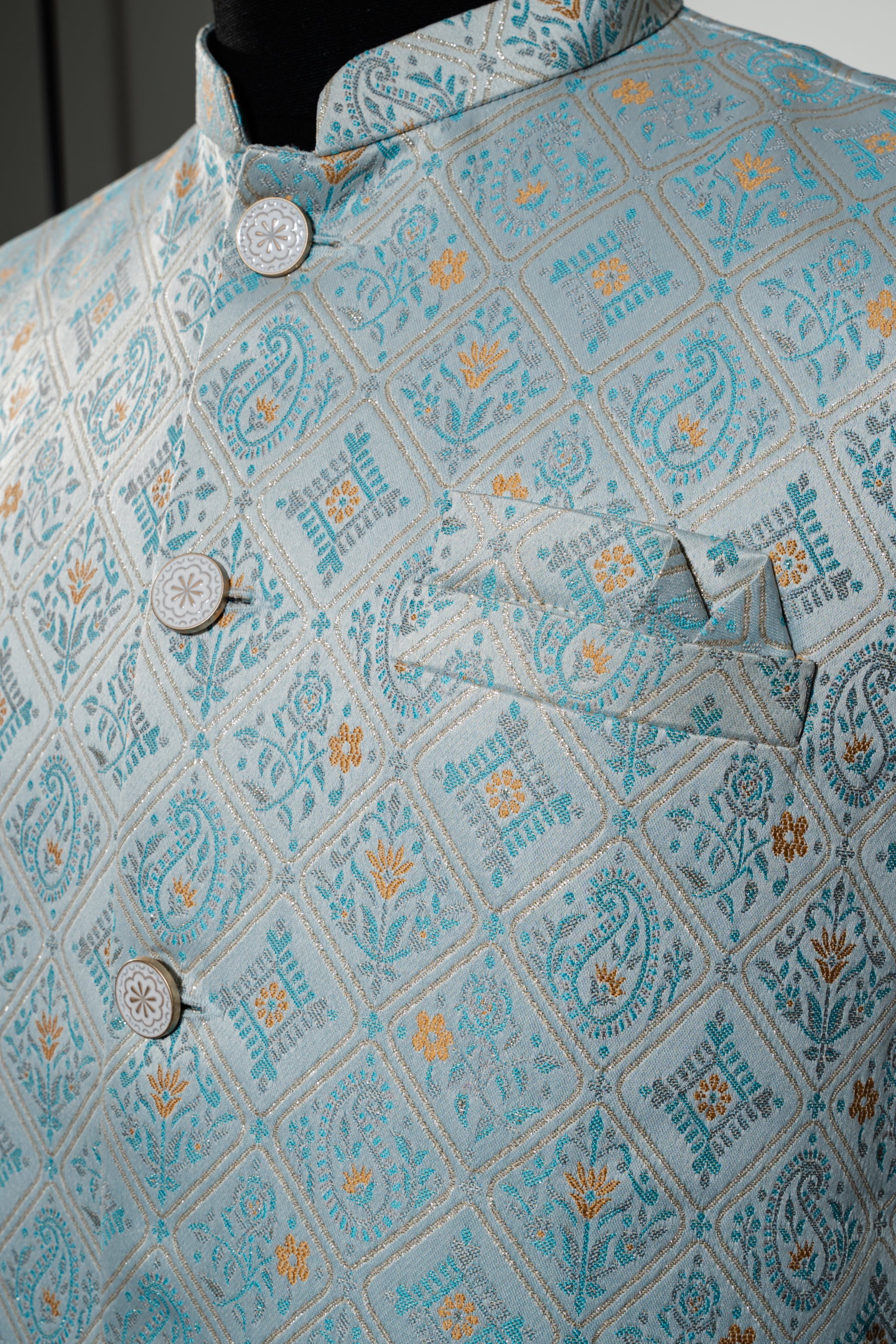 This rich Nehru jacket features a striking digital print design, making it a stylish addition to plain kurtas. The set includes the Nehru jacket and a matching pocket square for a polished look. It is recommended to be dry cleaned for optimal care.