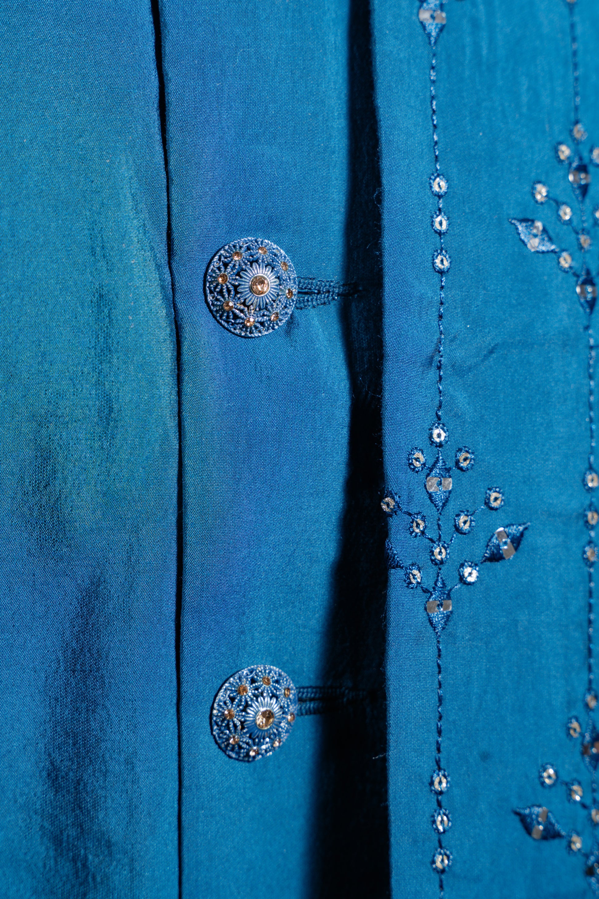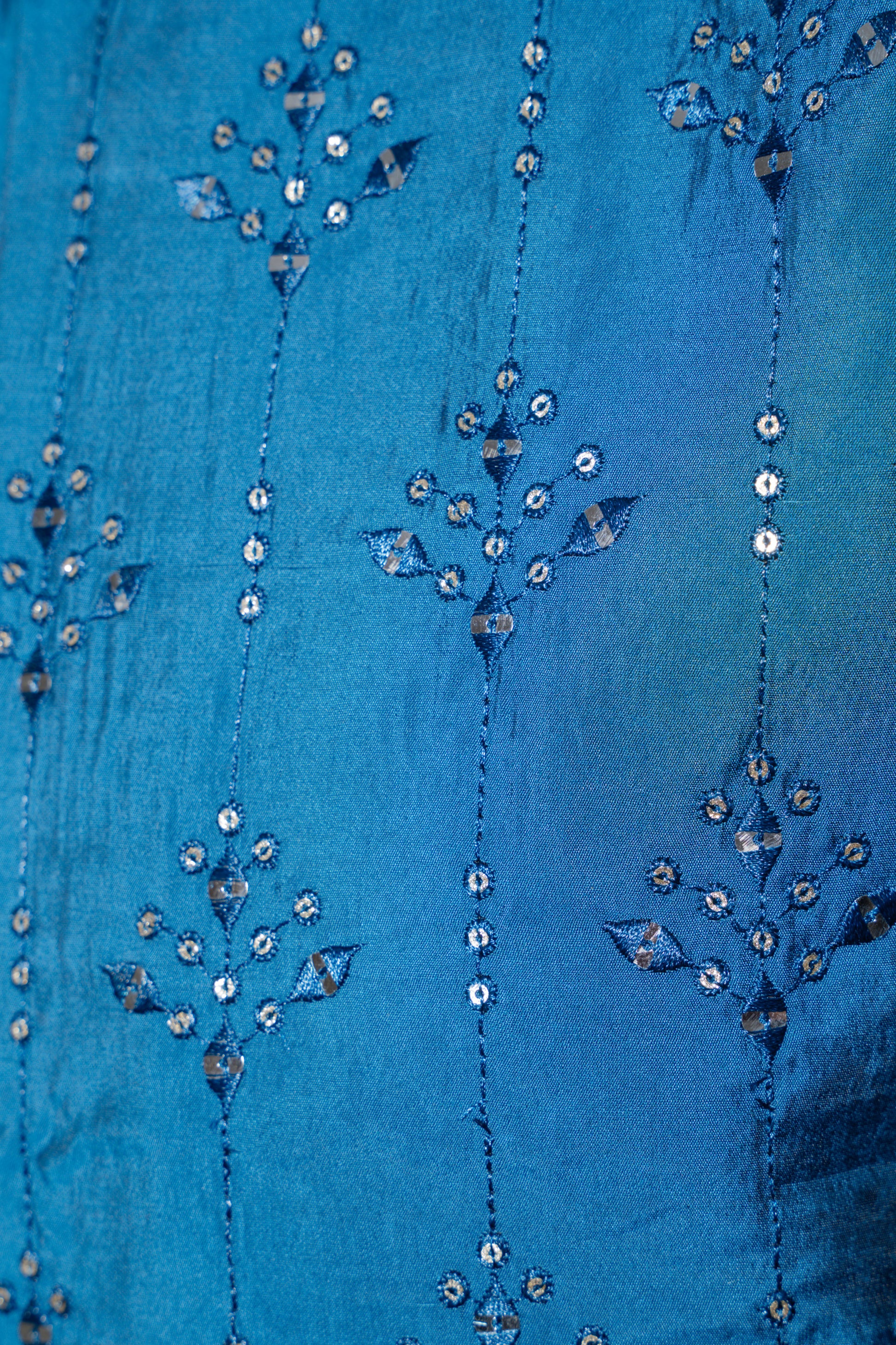Discover the stunning style of our firoze-blue Indo-Western set. Made with luxurious soft cotton-silk fabric, this set features intricate mirror and sequin work, adding a touch of elegance to the outfit. The set includes mirror and sequined jacket, a pant, and a kurta. To preserve its beauty, simply dry clean only.