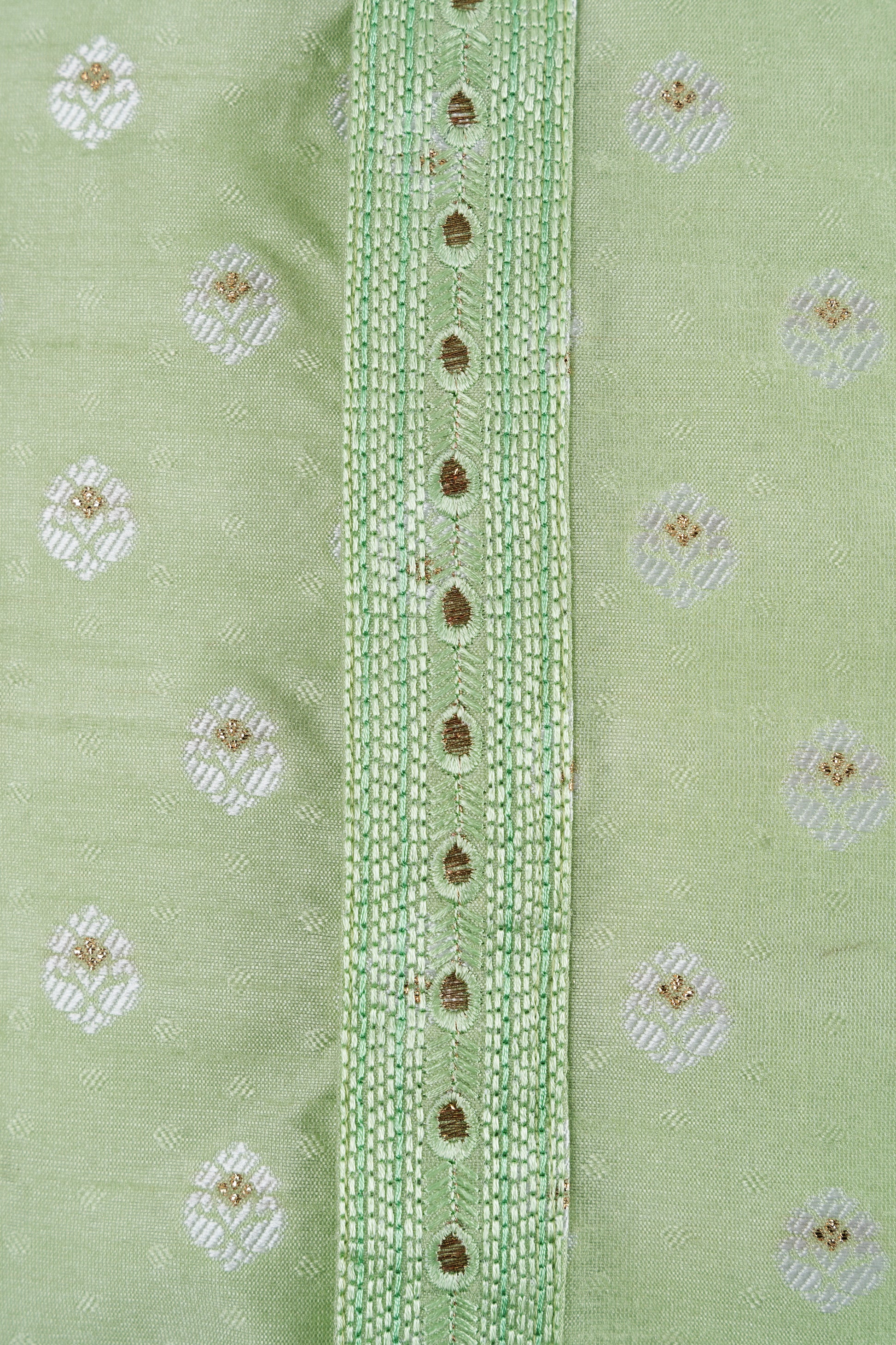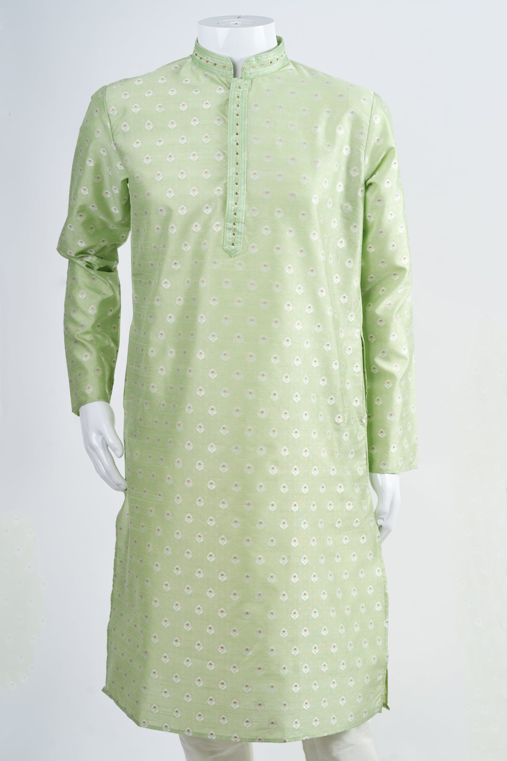 This Lime Green Kurta set boasts a delicate color and is made of art silk fabric. The intricate motif design adds a touch of elegance to this kurta, making it a stylish choice for any traditional occasion. This set includes a kurta and pants (pyjama), and is recommended for dry clean only for long-lasting wear.