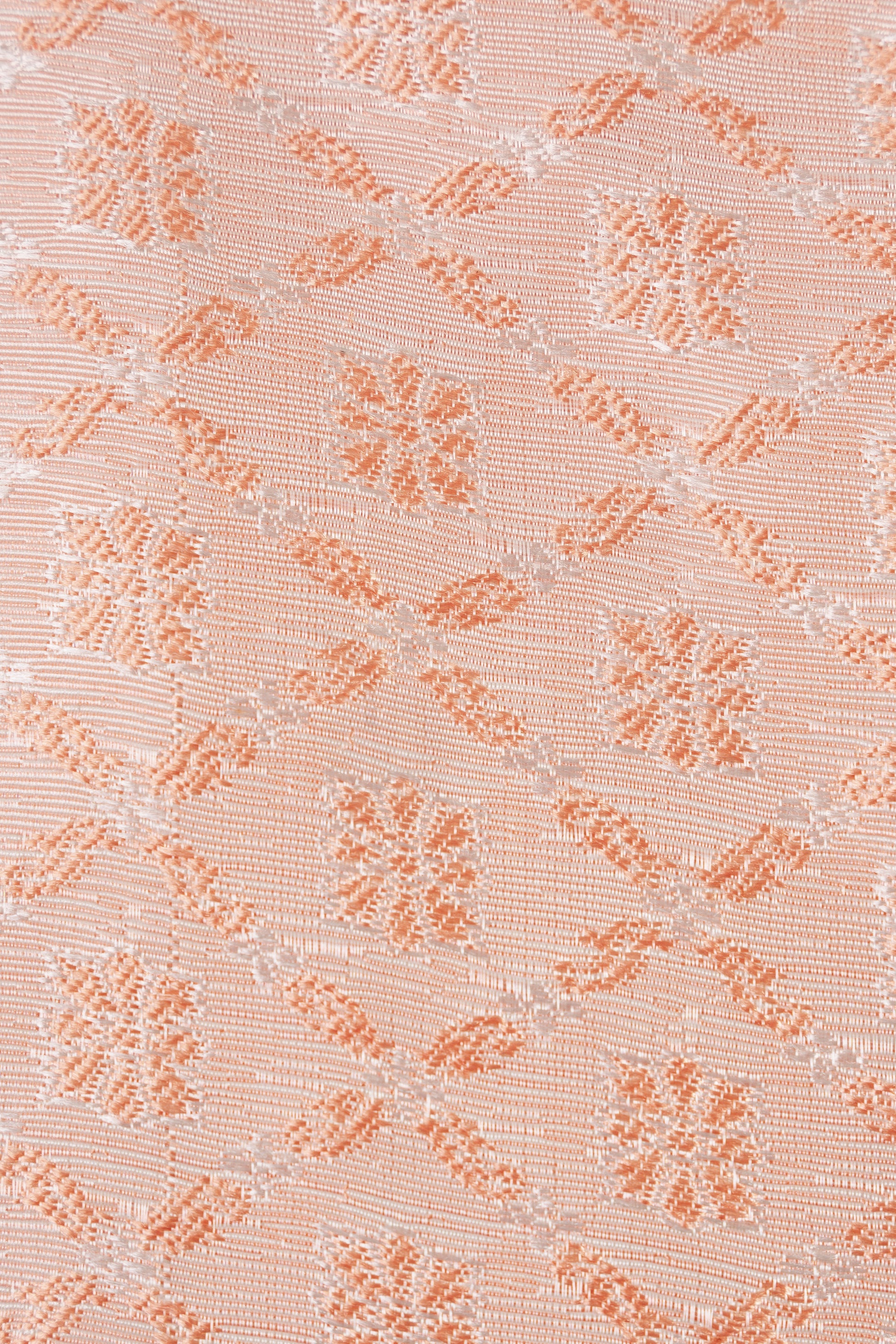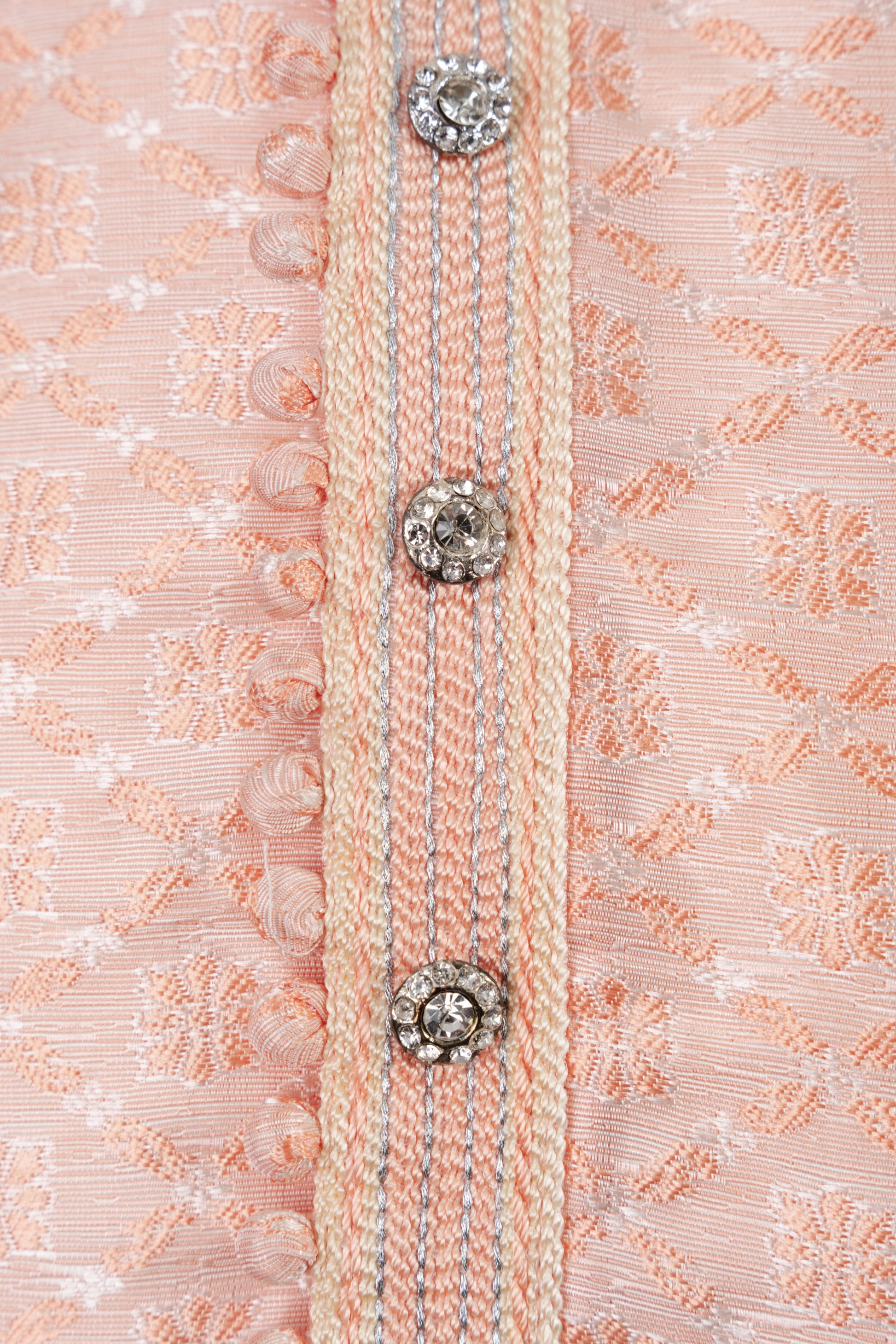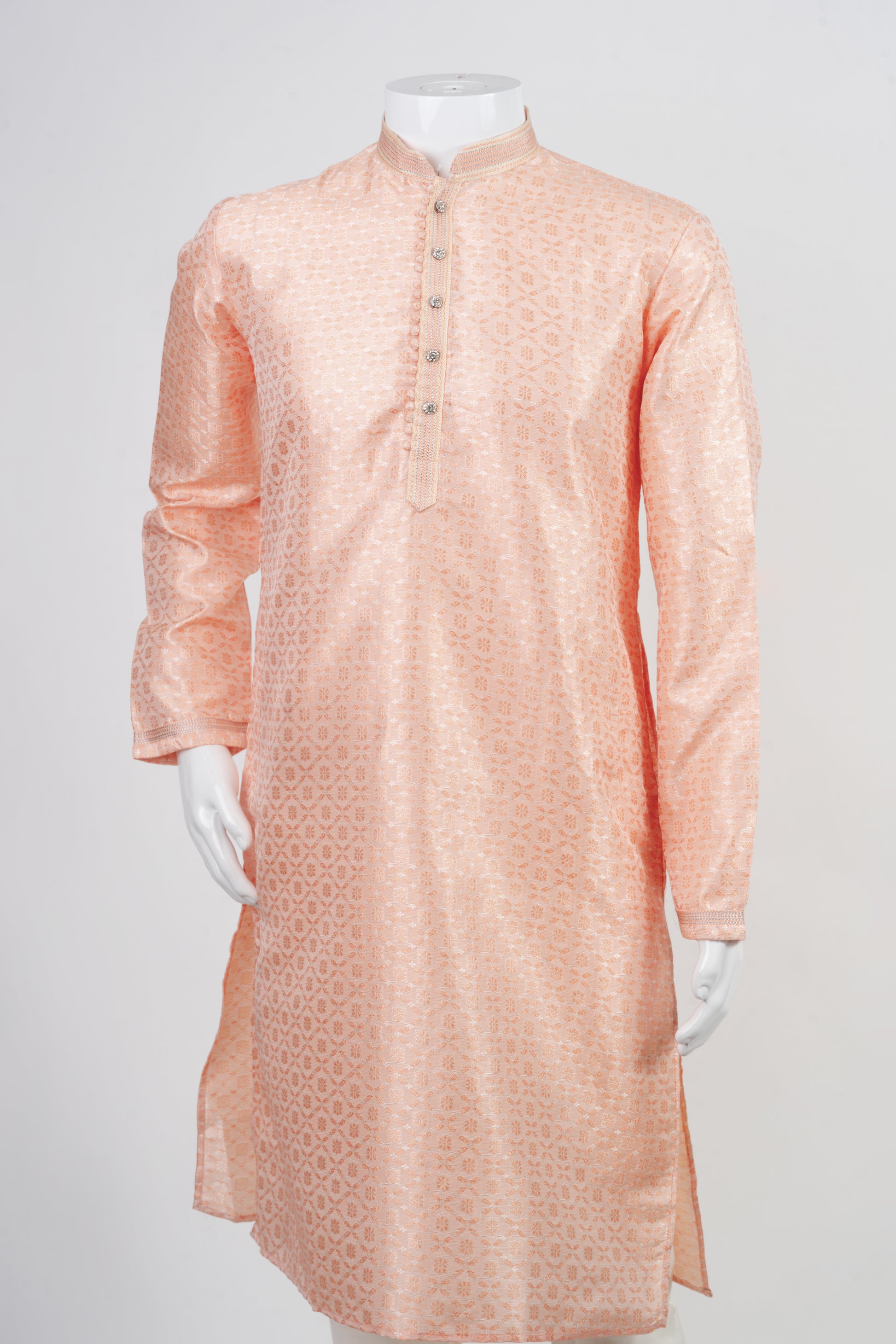 The Kurta is expertly crafted from high-quality art silk fabric in a shade of melon-peach. The intricate jacquard design showcases the precision and skill of the craftsmanship. This set includes a kurta and pants, perfect for a special occasion. For best results, dry clean only.