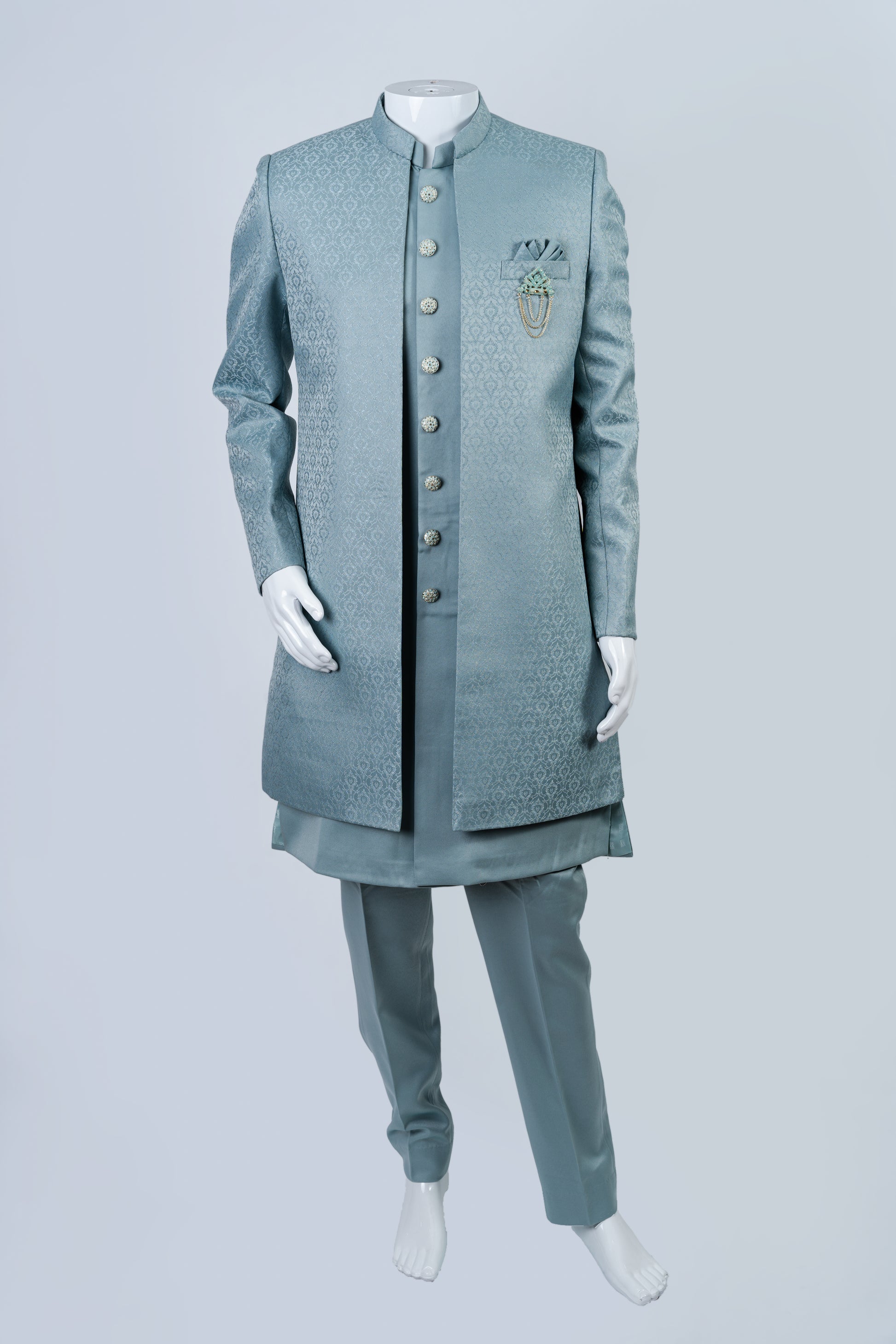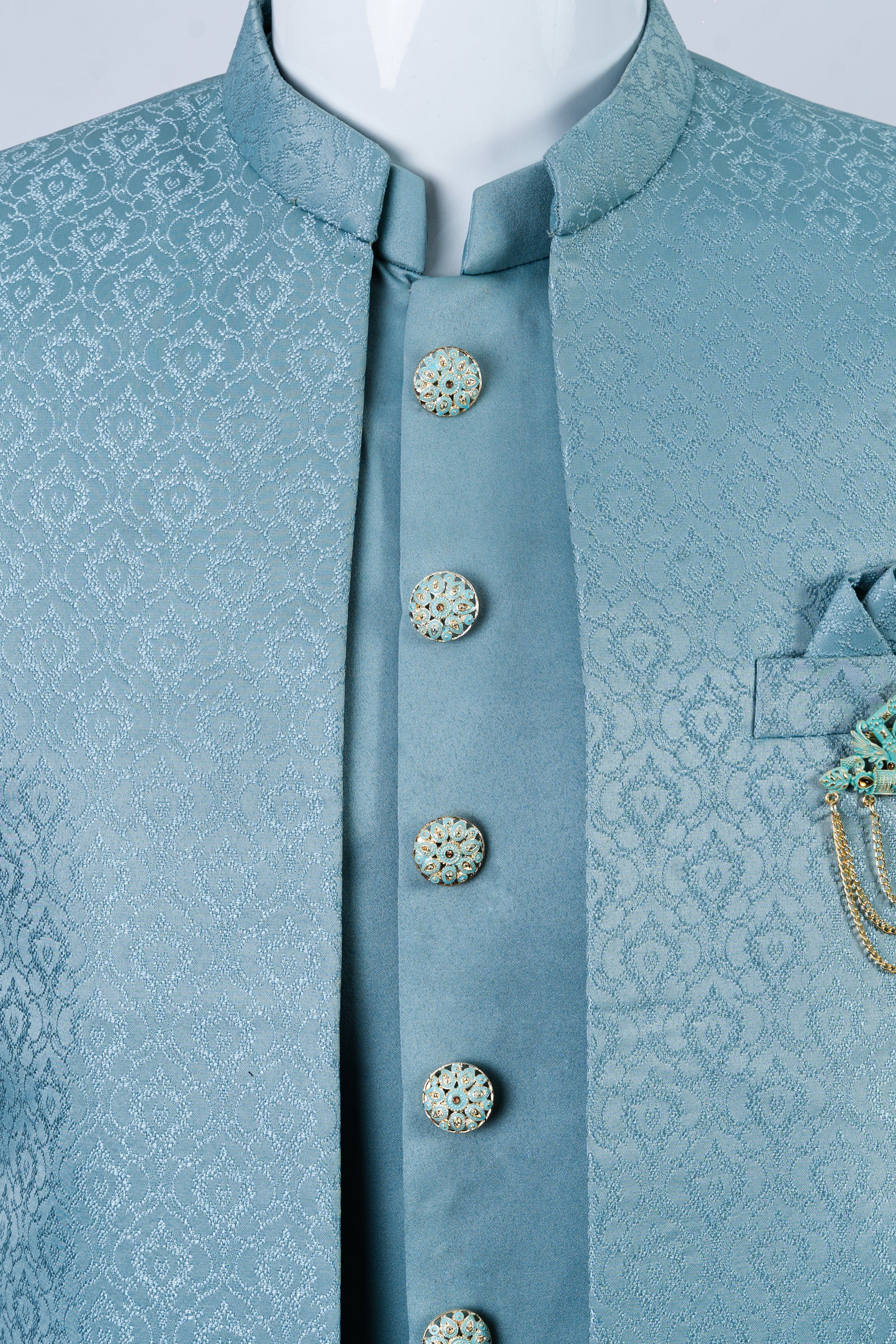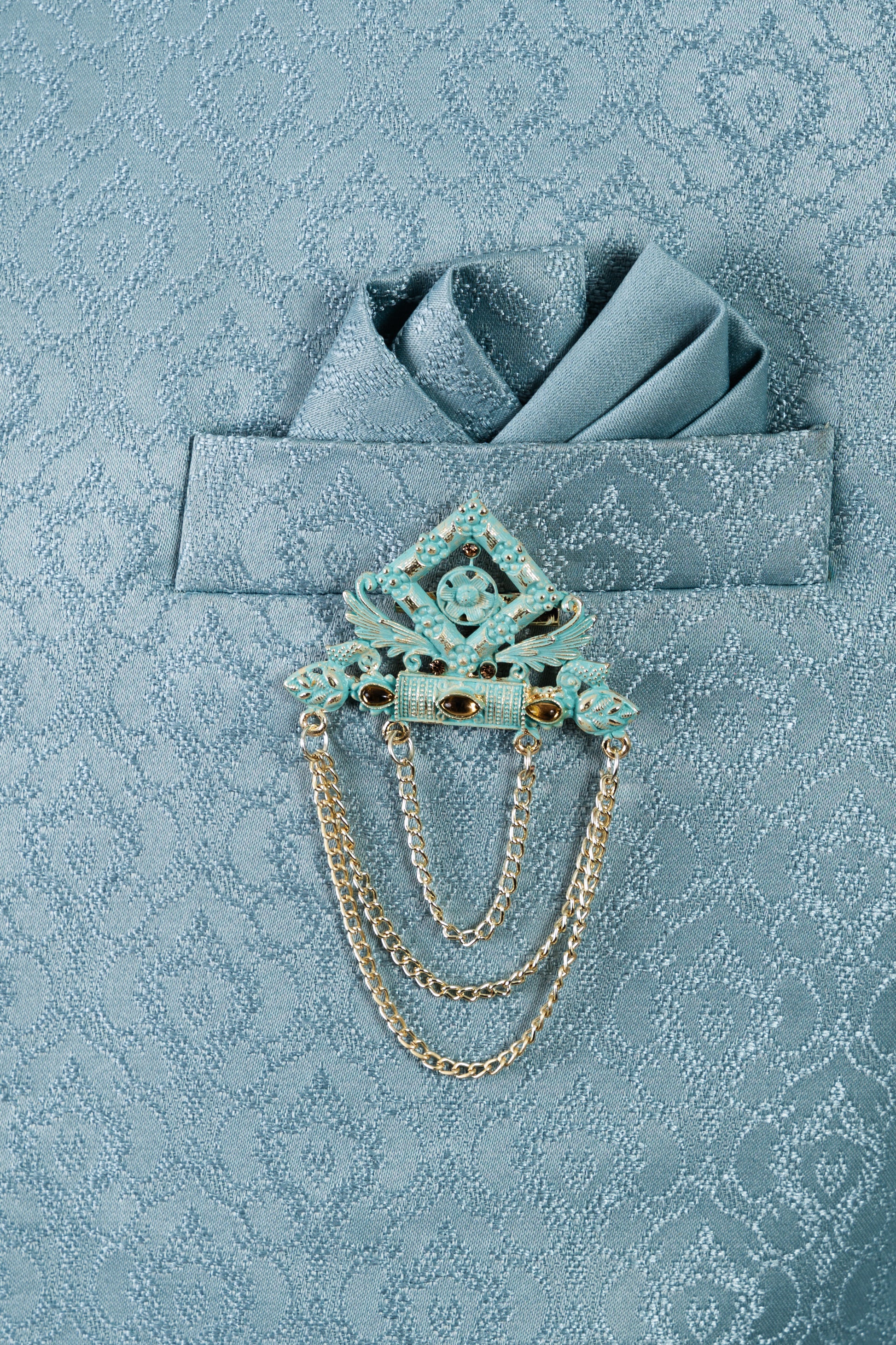 Expertly crafted with blended rayon fabric, this mint-green Indo-Western set offers a self-textured design for an elegant look. The set includes a jacket, pant, kurta, pocket square, and a brooch. Keep it looking like new with dry clean only care. Elevate your wardrobe with this elegant and classic set.