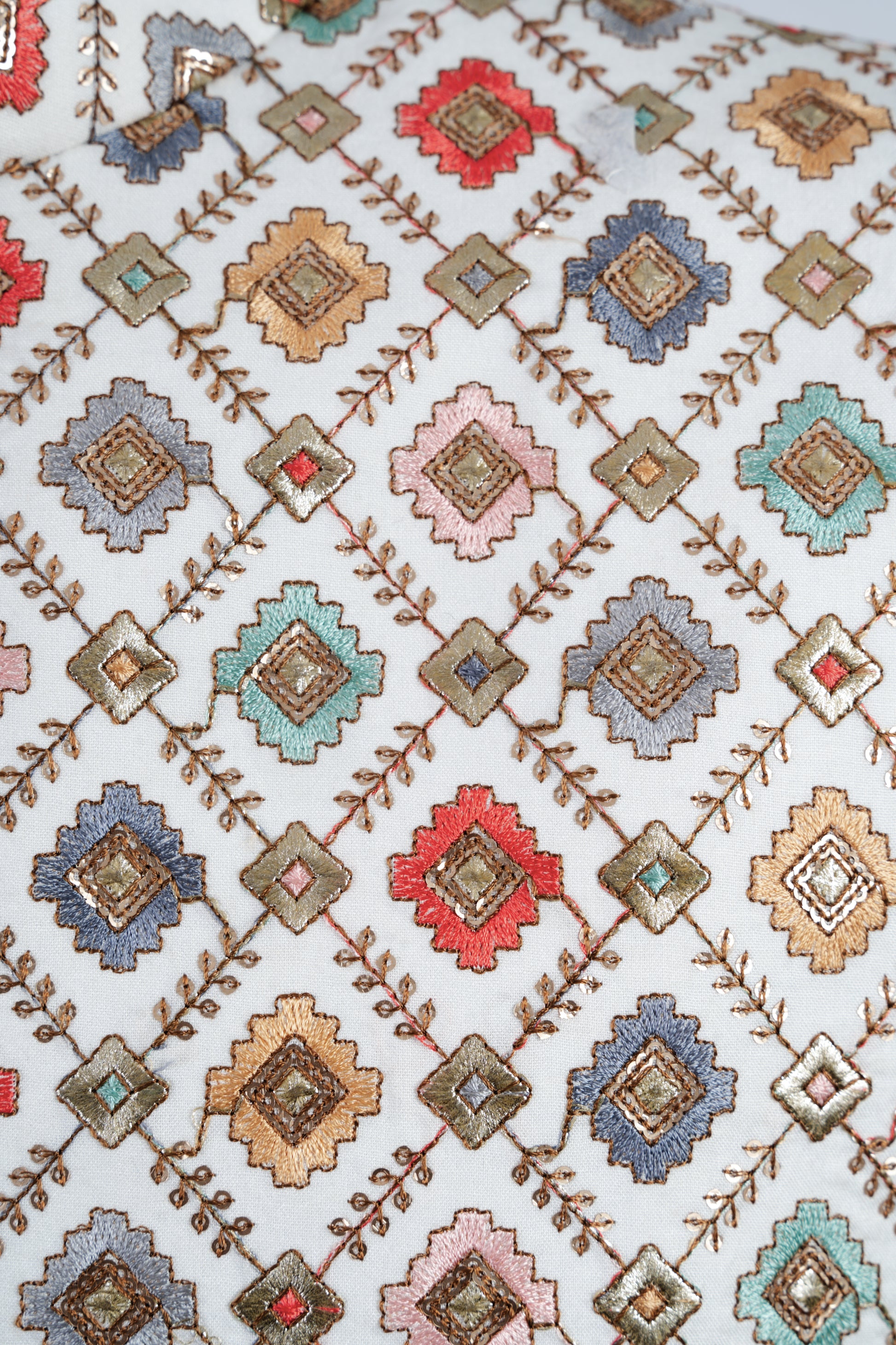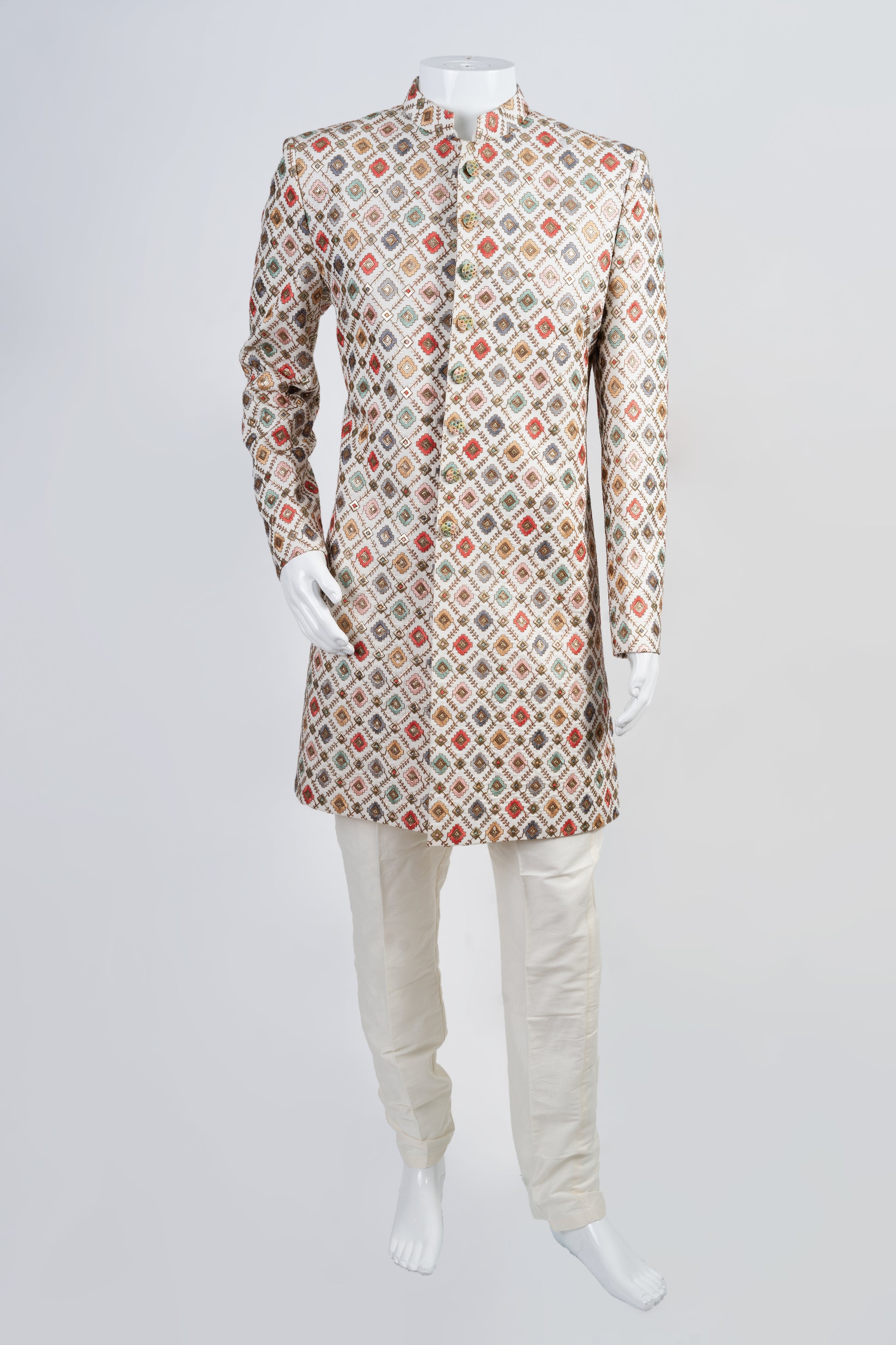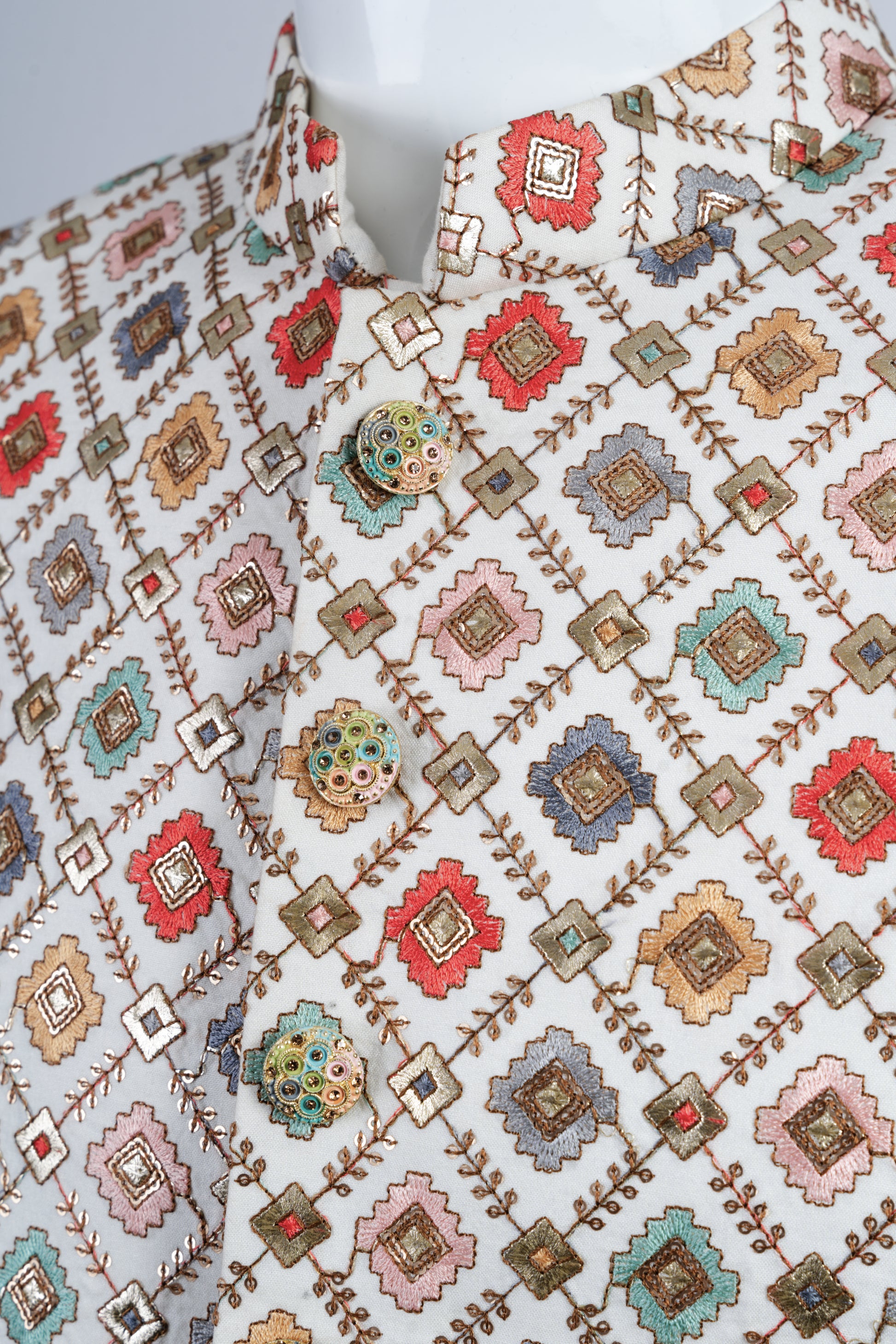 Elevate your style with our unique multi-coloured sherwani. Featuring intricate multi-coloured threadwork and exquisite buttons, this set includes both the jacket and pants for a complete look. Make a statement and stand out from the crowd with this exclusive ensemble.