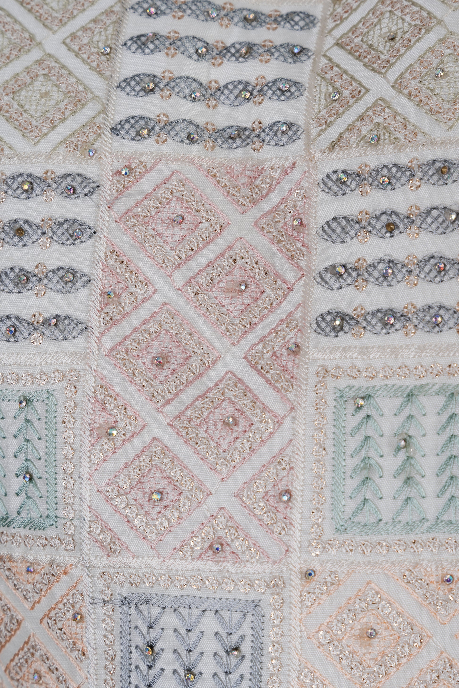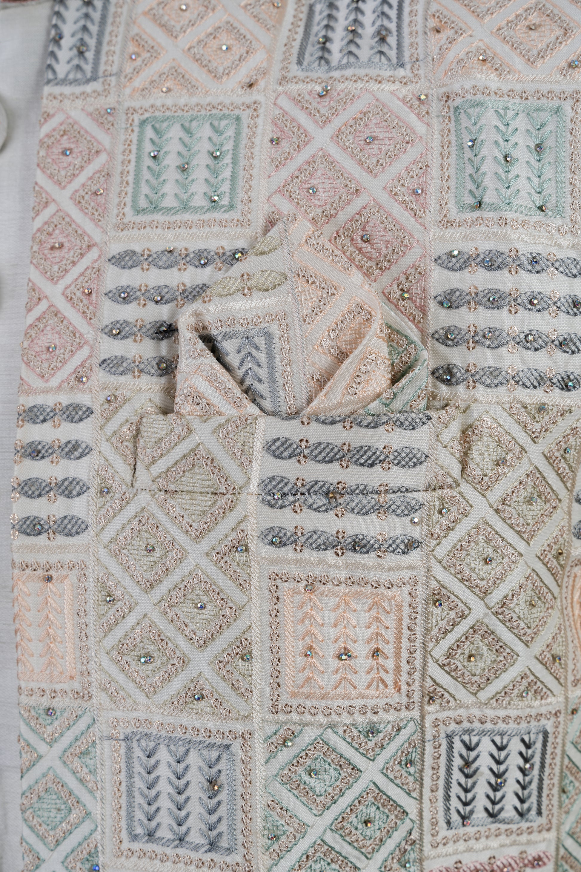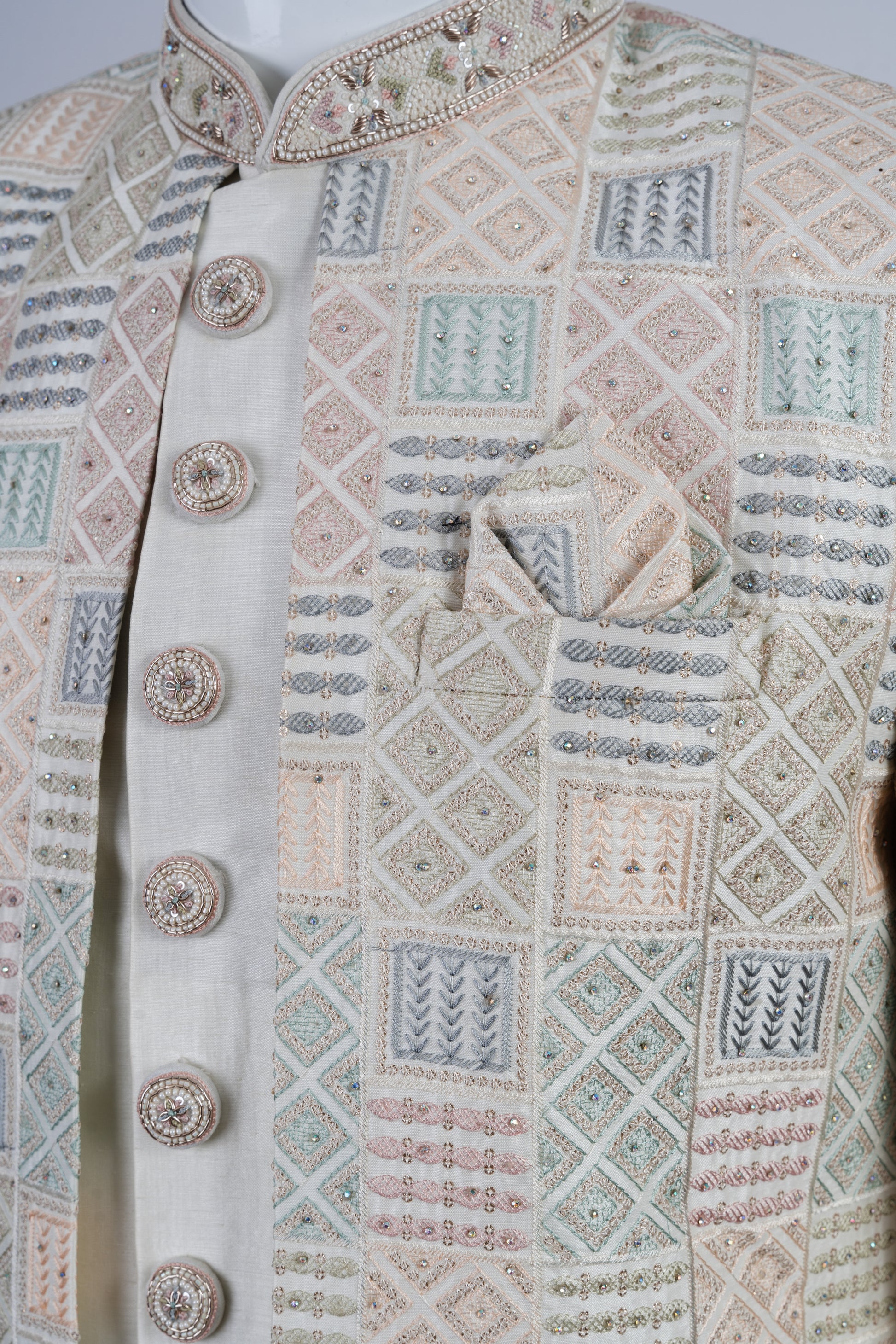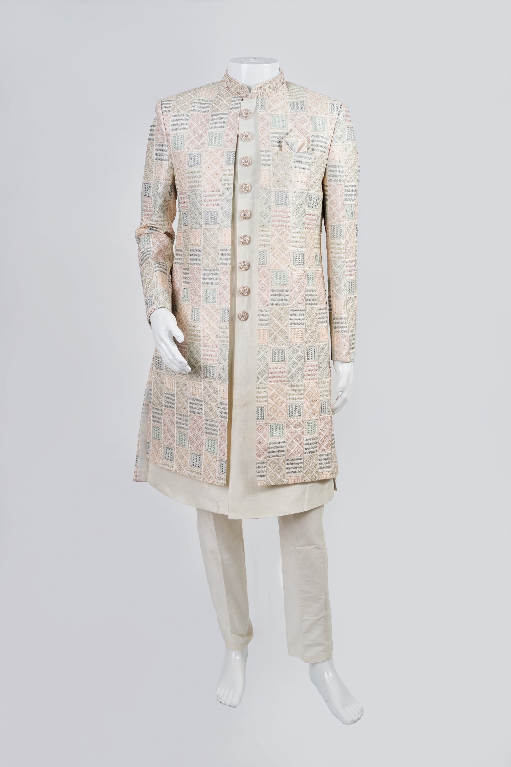 Elevate your style with our multi-coloured achkan style sherwani. The intricate, multi-colored threadwork and sequin work as well as the stone embellishments on the collar and buttons exude opulence. This set includes both the jacket and pants for a complete, sophisticated look. For optimal care, dry clean only.