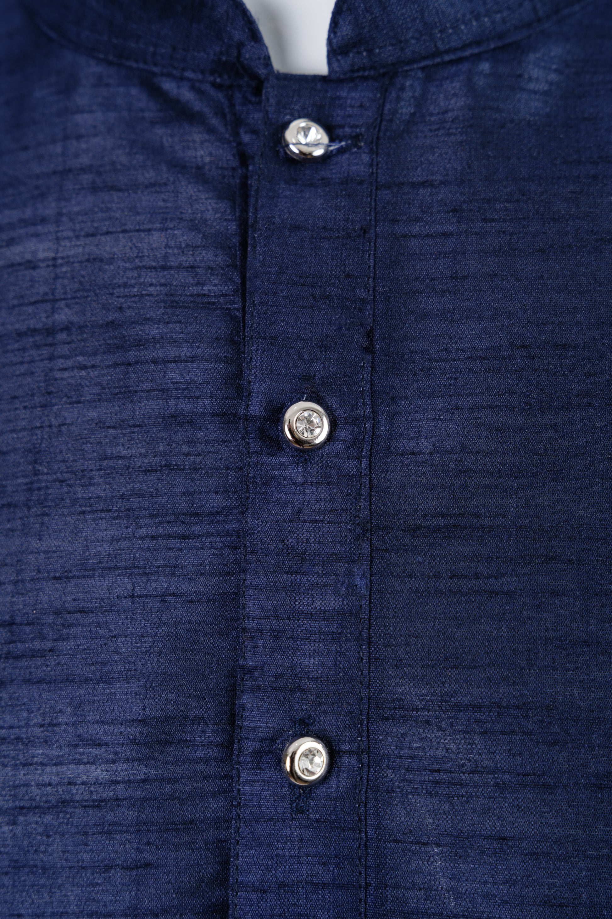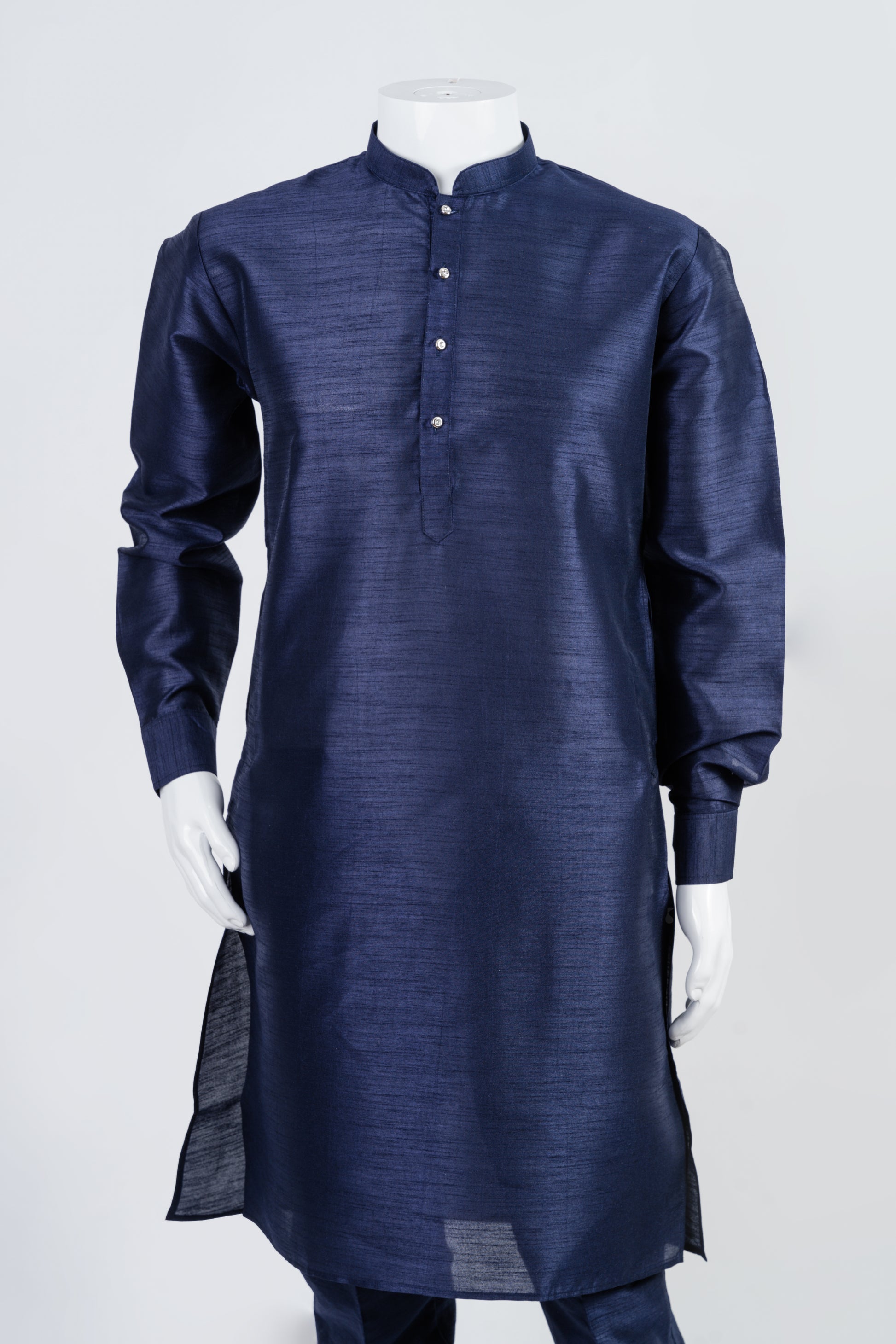 This Navy Blue Kurta Set is made of high-quality cotton fabric and features a classic plain design. It includes a kurta and pants (pyjama), making it a complete and stylish outfit. For wash care, it is recommended to dry clean only.