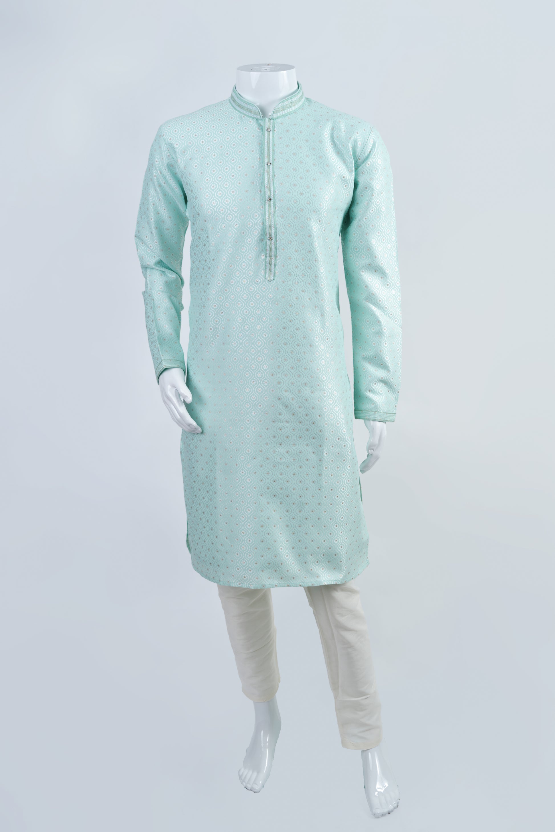 This Pastel Green Kurta set boasts a delicate color and is made of art silk fabric. The intricate motif design adds a touch of elegance to this kurta, making it a stylish choice for any traditional occasion. This set includes a kurta and pants, and is recommended for dry clean only for long-lasting wear.