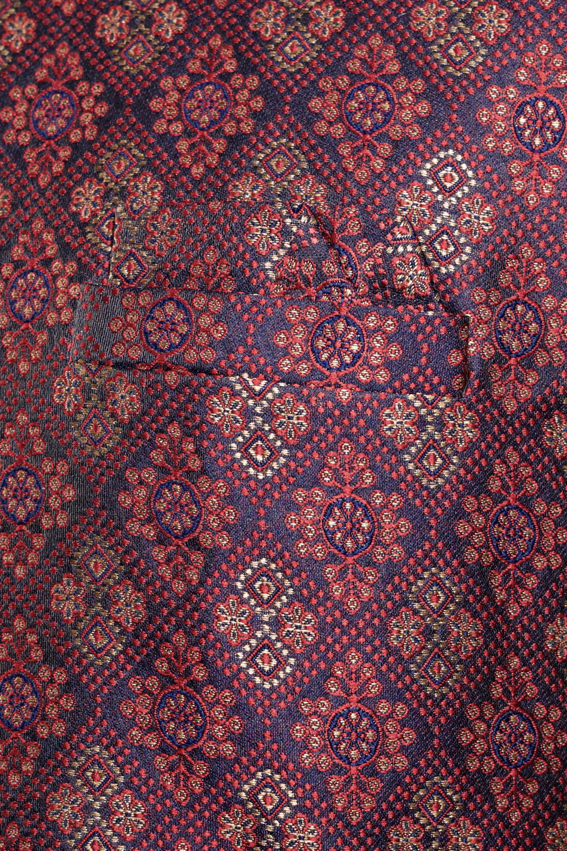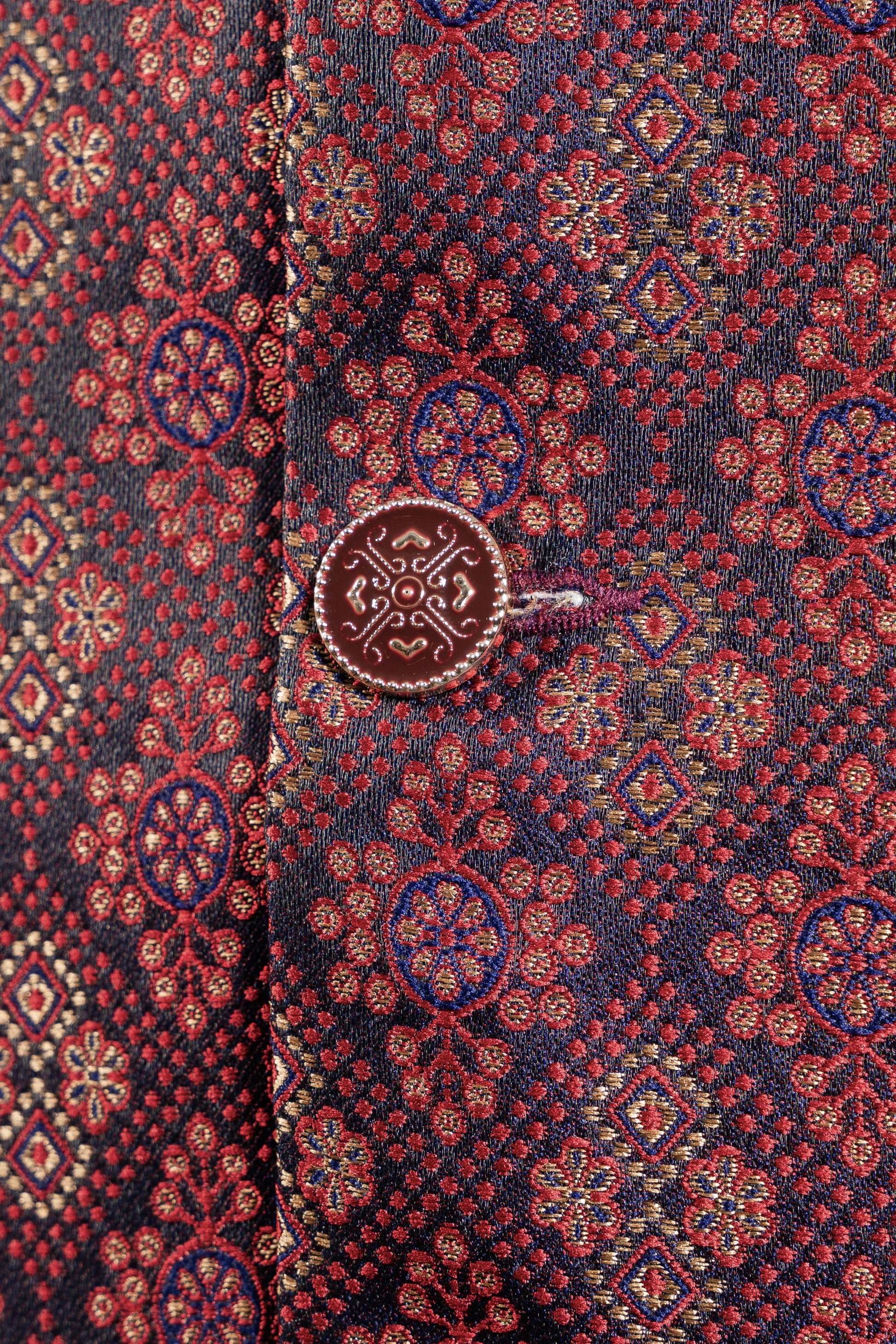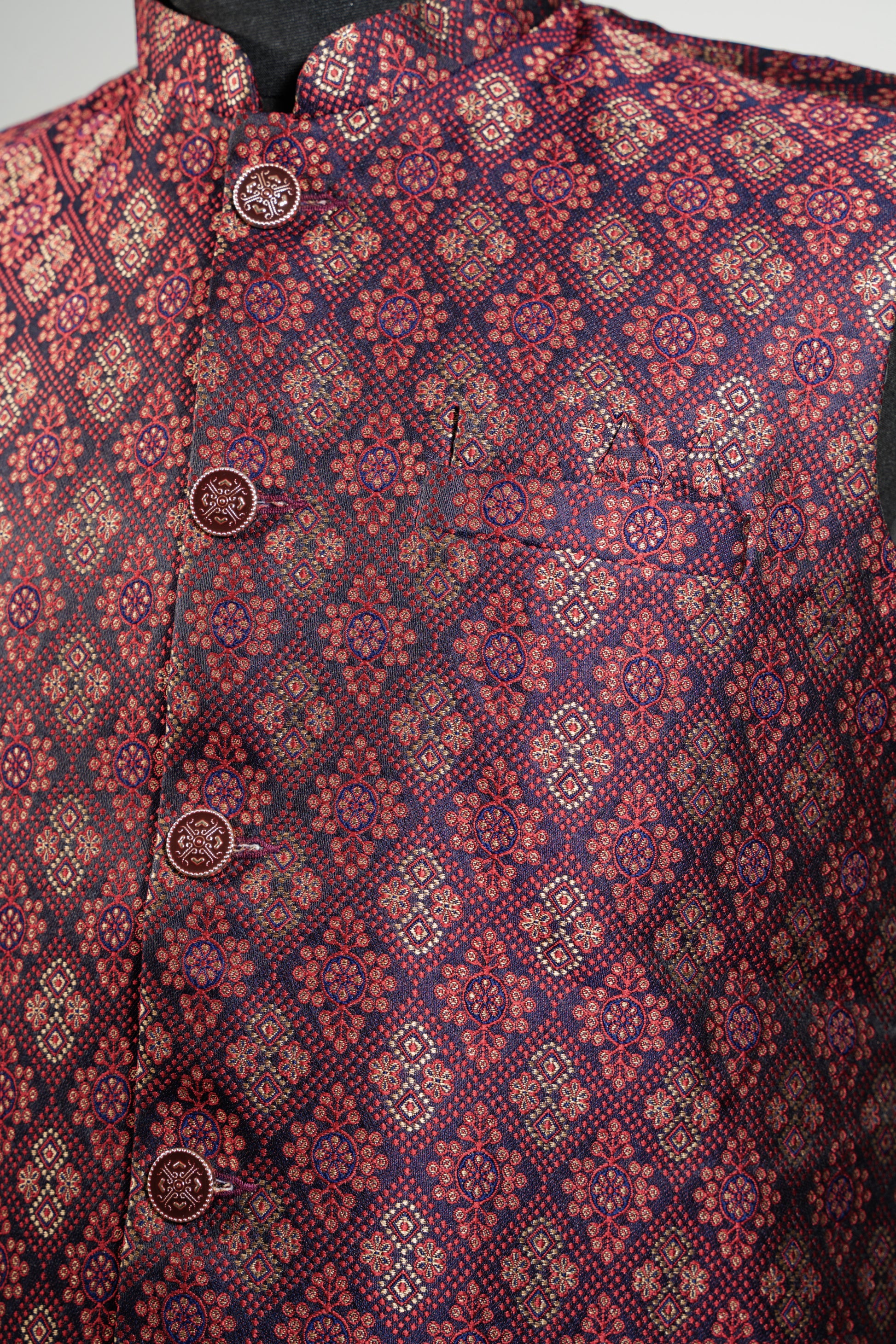 Add a touch of elegance to your ethnic ensemble with our red printed Nehru jacket. Made of soft art silk, this waist coat features a sleek and modern digital print design. It comes with a matching pocket square for a classic finishing touch. For easy maintenance, simply dry clean only.