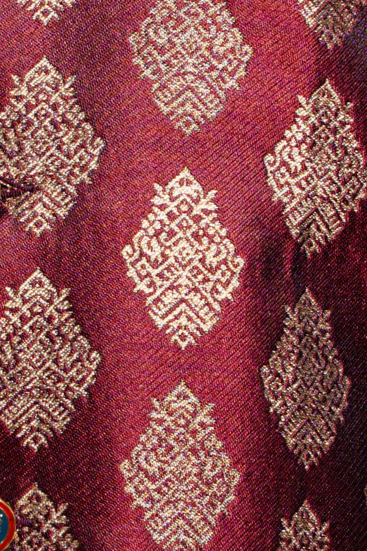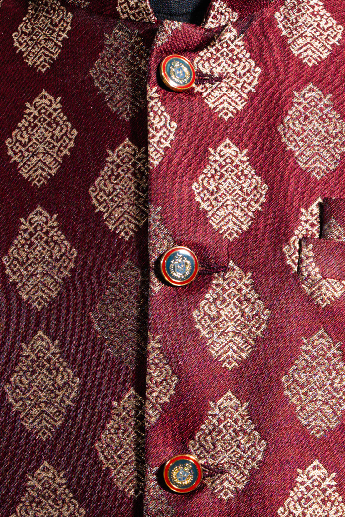 This regal Nehru jacket boasts a rich red and gold digital print design, crafted from soft art silk. Set includes the jacket and a matching pocket square. Keep this statement piece in pristine condition with dry cleaning.