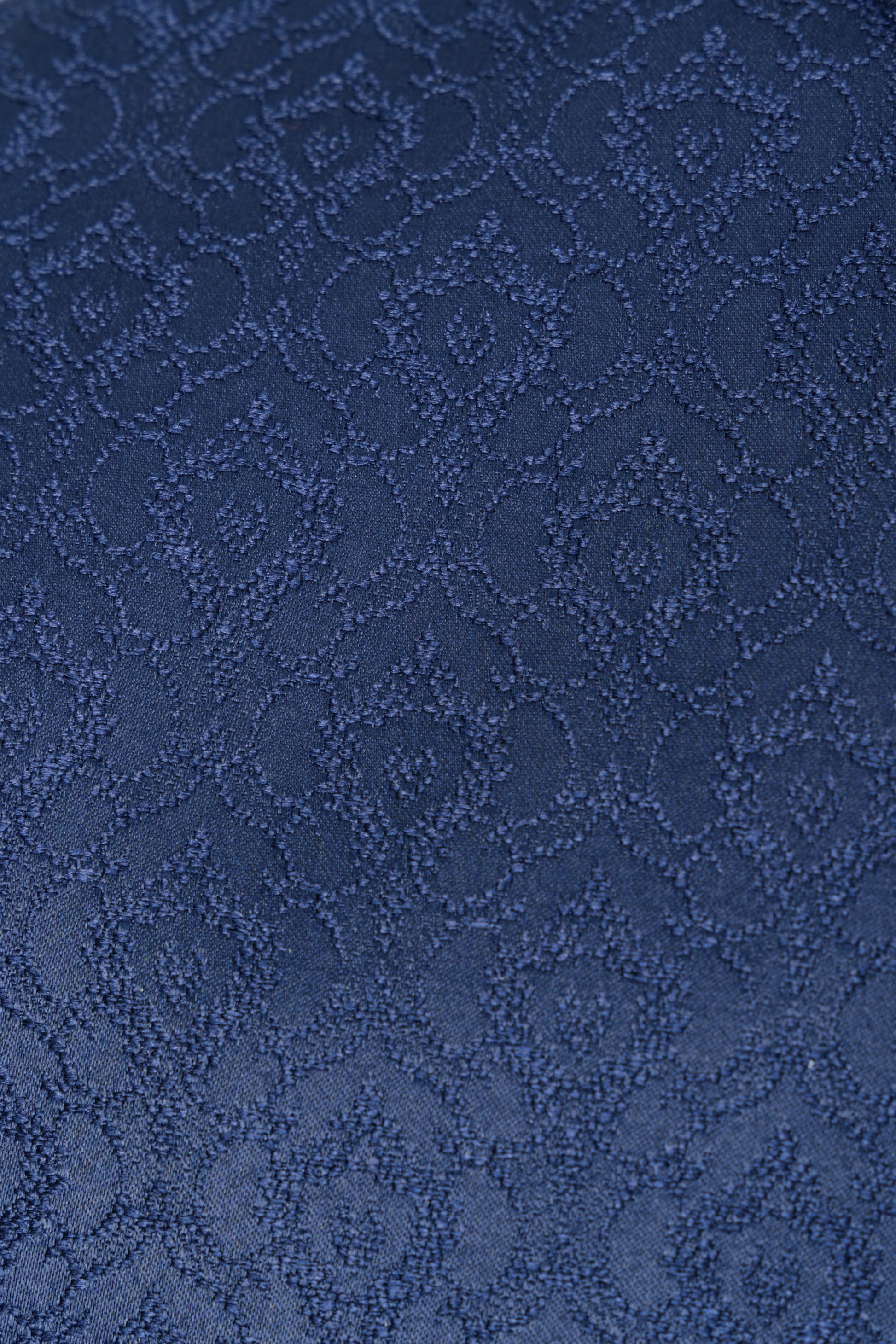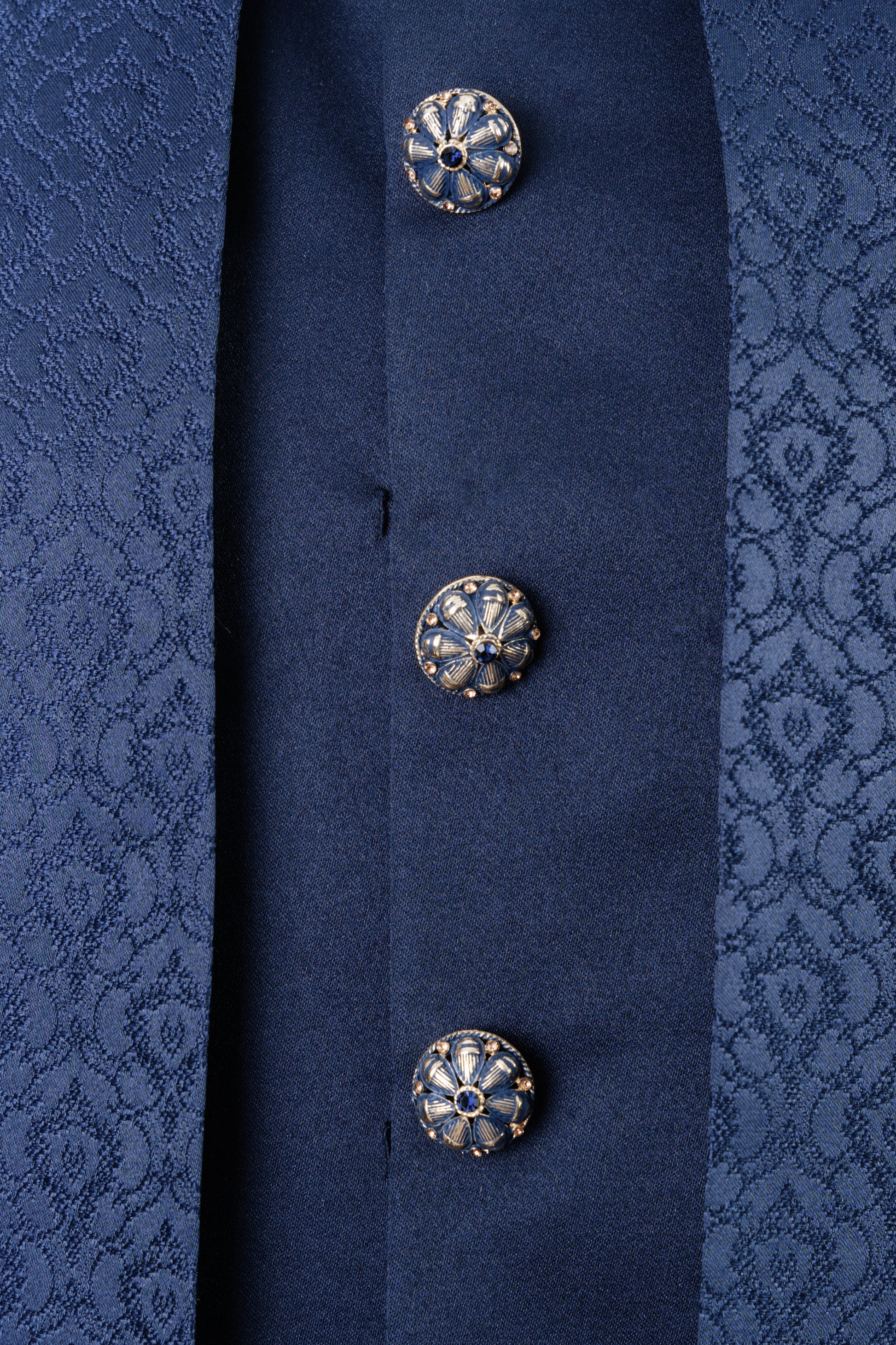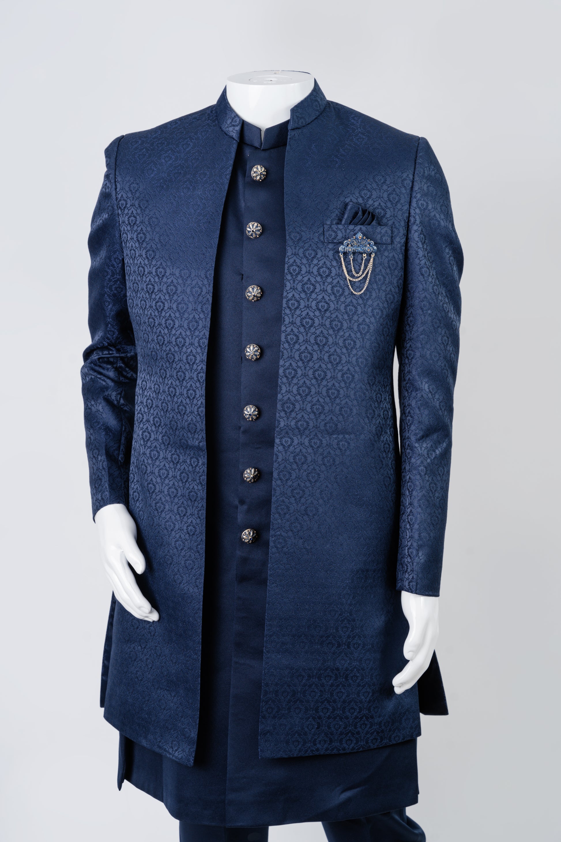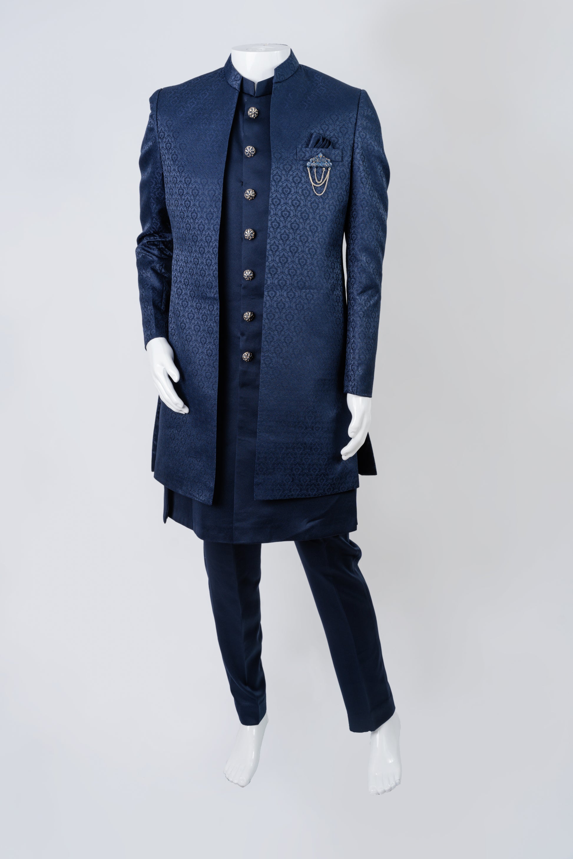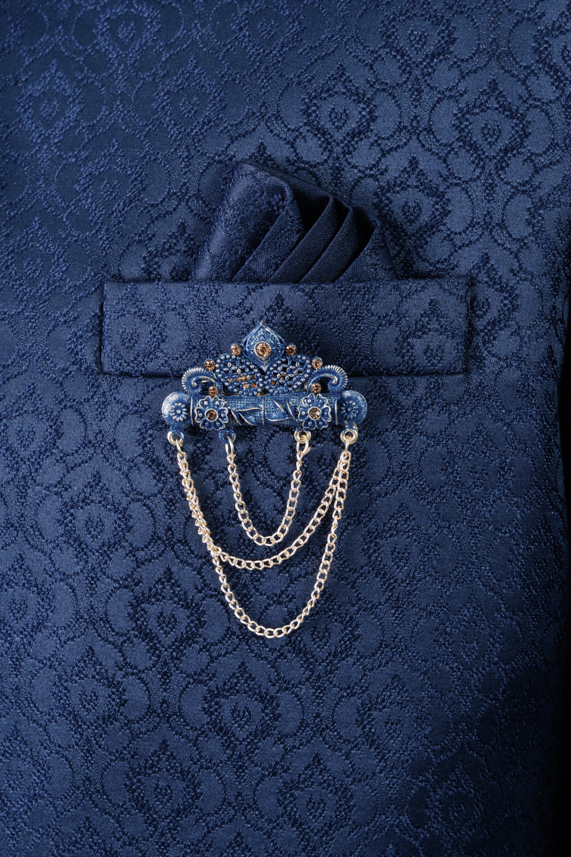Expertly crafted with blended rayon fabric, this sapphire blue Indo-Western set offers a self-textured design for an elegant look. The set includes a jacket, pant, kurta, pocket square, and a brooch. Keep it looking like new with dry clean only care. Elevate your wardrobe with this elegant and classic set.