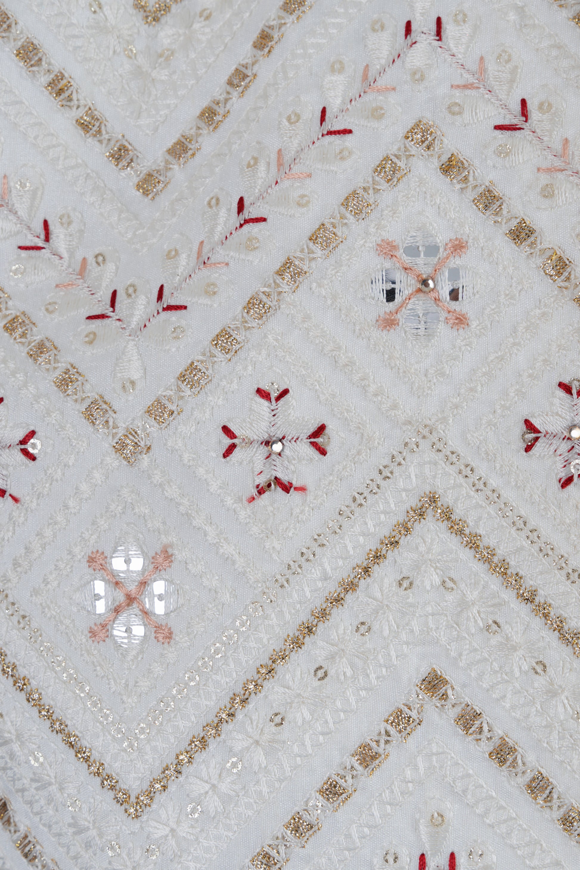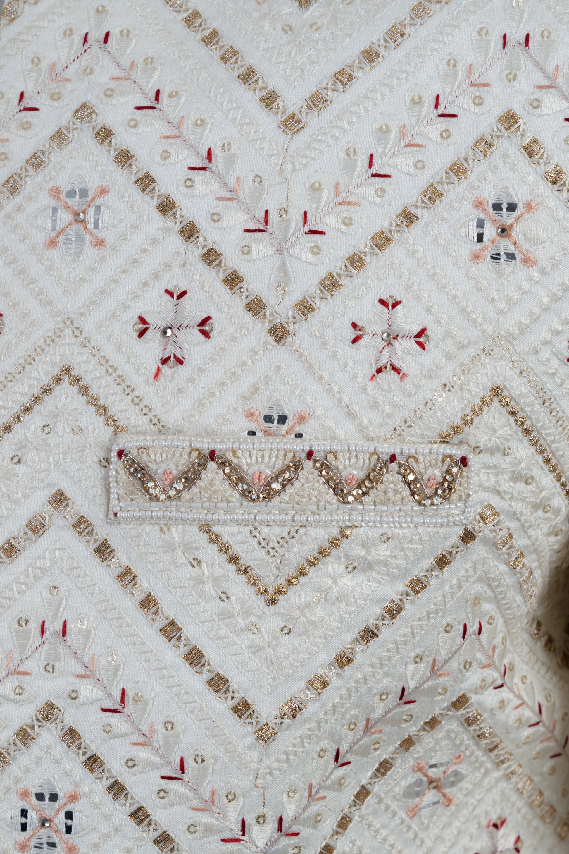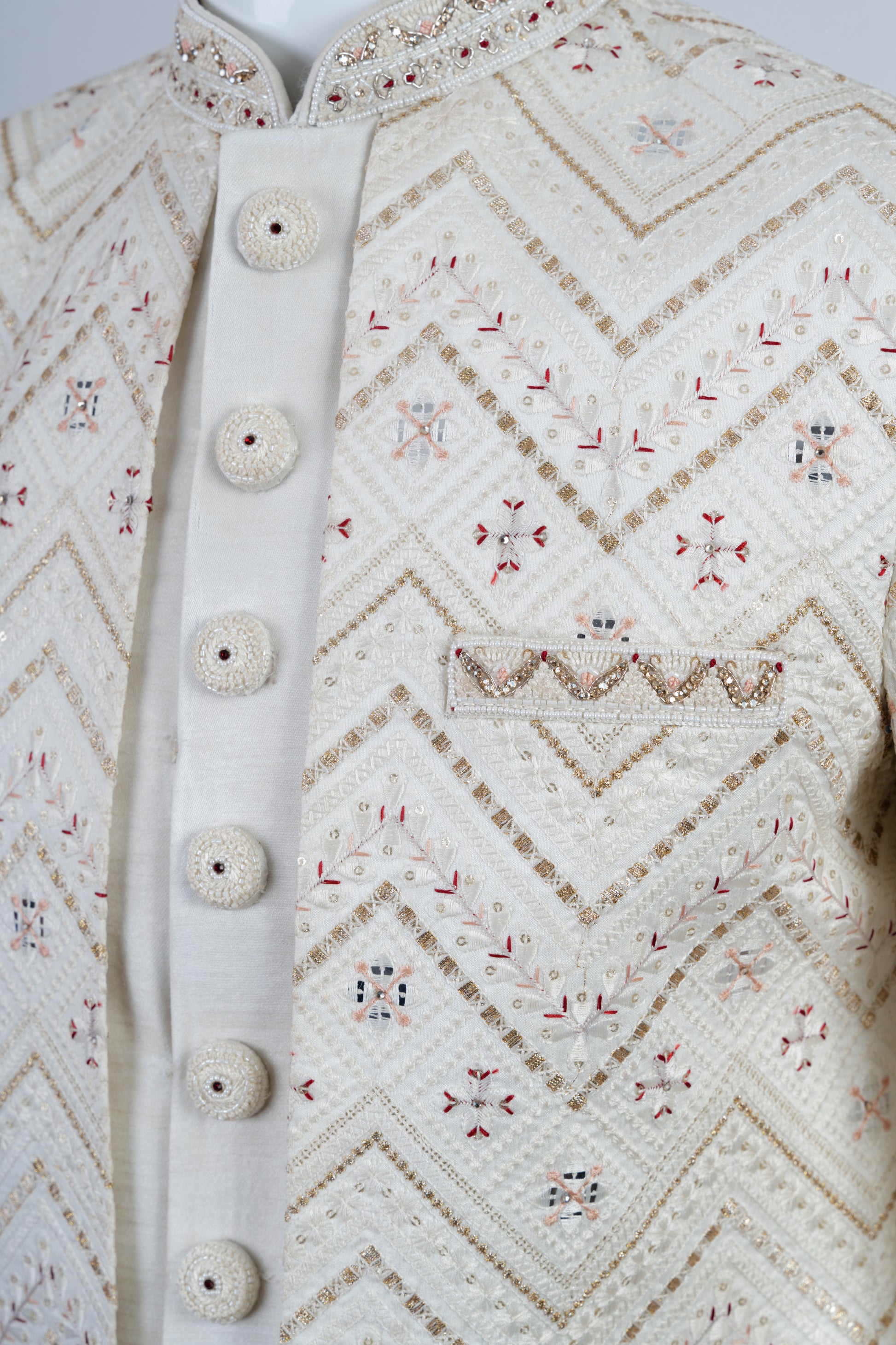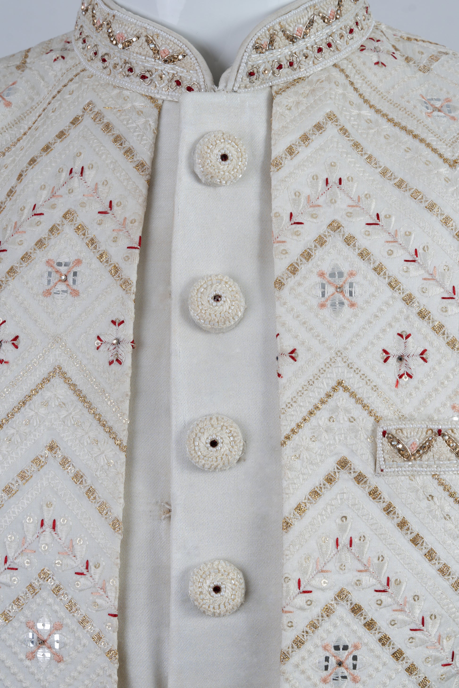 Wrap yourself in luxury with our warm white embroidered sherwani. Made from high-quality blended rayon, this jacket and pant set features intricate machine embroidery and sequin work for an exclusive and sophisticated look. Keep it looking pristine with dry cleaning. Elevate your ethnic look with this elegant ensemble.